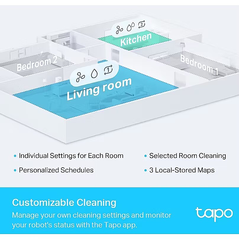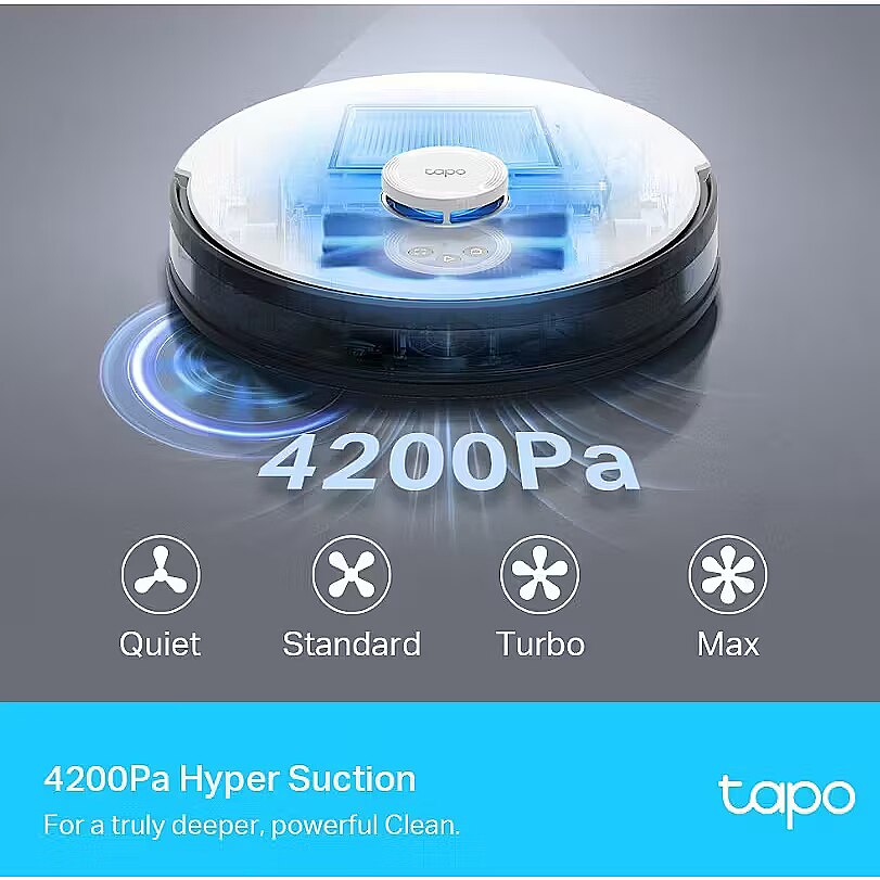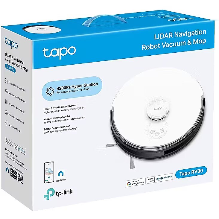 LongDesc - LiDAR Navigation Robot Vacuum & MopA Facile Way of CleaningLiDAR Navigation Robot Vacuum & MopHyper Suction. A Deeper, Powerful Clean.Four vacuum modes with different levels of suction power match various surfaces and dirt. With industry-leading suction power up to 4200Pa, the RV30 is designed for a deeper clean that sweeps away debris sandwiched between gaps and dust hidden in carpets, leaving nothing but a spotless floor.Quiet ModeEnjoy peace of mind with volume down to 55 dB, ideal for dust and hair.Standard ModeBest balance between suction power and battery life, ideal for daily cleaning.Turbo ModePull the large particles out of carpets effortlessly.Max Give your thick carpets a truly deep clean with serious suction power.Auto-Boost to Max Modewhen encountering carpets for a deep clean.HEPA Filtercaptures 99.9% of allergens as small as 0.3 microns.3Floating Suction Mouthsticks closely to the ground to remove gap dust.Detachable Main Brushmakes it easy to clean the tangled hair for improved maintenance.High-Precision Dual Navi SystemA LiDAR and Gyro dual navigation system serves as the brain of the robot and accurately maps out your house in minutes, avoids omissions and repeated cleaning, and even works well in the dark.Customizable Cleaning Fits Your RoutineMulti-Floor Local-Stored MapsAccurately recognizes different floors faster with 3 local-stored maps.Virtual Walls and No-Go ZonesSet up areas you don't want the robot to go, such as kids’ play areas or bedrooms in use.Personalized SchedulesStart cleaning when you finish meals automatically, sync the robot’s routine to your daily habits.Selected Room CleaningSelect the room which needs the most attention to clean.Specific Zone CleaningMark off specific areas for yourTapo Robot Vacuum to clean.Individual Settings for Each RoomCustomize different vacuuming modes, mopping modes, and cleaning schedules for each room.Vacuum and Mop ComboVacuuming sucks up floating dust and mopping tackles sticky messes. Mopping is essential for homes with hard floors that need regular polishing. With an electronic pump, RV30 provides 3 water flows to suit different floor types with consistent and steady water pressure.*For best results, use the Tapo Multi-Surface Floor Cleaning Solution.45000mAh Energy-Dense BatteryTapo RV30 provides 3 hours of continuous whole home cleaning every full charge. The robot returns to the charging dock automatically when the battery gets low, and then restarts right where it left off.Obstacle Detection and Anti-CollisionCombining precision LiDAR navigation and a full suite of various sensors, Tapo RV30 accurately detects common objects to roam around obstacles, under furniture, and along wall edges, all while avoiding falls down stairs and ledges.Anti-Drop ProtectionMultiple cliff sensors help it avoid falling down stairs and ledges.Climbs When NeededEffortlessly climbs over doorsills and thick carpets under 2 cm / 0.79 in.6Speak to CleanPair with Amazon Alexa or Google Assistant to control the robot with simple voice commands. A series of Alexa custom skills are specially built for users to easily control how and when to start cleaning. Enjoy hands-free living.Child & Pet LockTapo RV30 prevents accidental and inconvenient starts with the child & pet lock. You can deactivate the device’s physical start button to prevent children or pets from accidentally turning the robot on.1. Based on internal testing carried out by the manufacturer, using quiet vacuuming mode. Actual results may vary according to the working status.2. Based on internal testing carried out by the manufacturer, using quiet vacuuming mode with a full battery. Actual results may vary according to the working status and home environment.3. Based on internal testing carried out by the manufacturer according to IEST-RP-CC021.4-2016 standards.4. Adding unofficially designated floor cleaner may cause structural damage to the water tank.5. Based on internal testing carried out by the manufacturer, using low water flow with a full battery. Actual results may vary according to the home environment.6. The crossing height will be reduced if the mop cloth mount is installed.