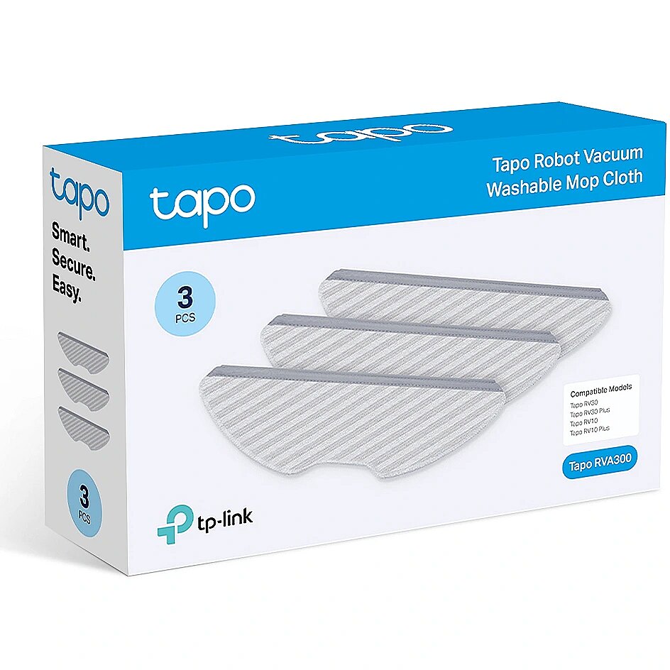 Description - Tapo RVA300 Tapo Robot Vacuum Washable Mop Cloth - Compatible Models: Tapo RV30 Plus, Tapo RV30, Tapo RV10 Plus, Tapo RV10 - Package Contents: Washable Mop Cloth ×3 - Easy to wash and can be reused many times over. - Easy to install. No tools required.