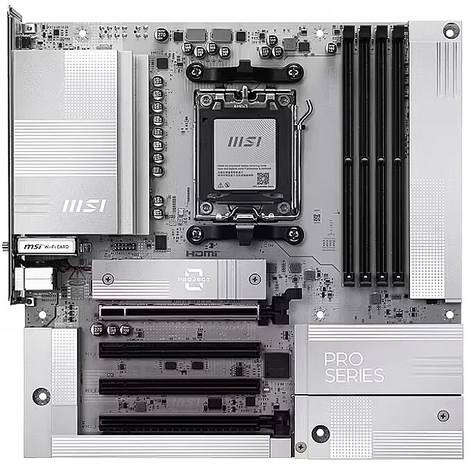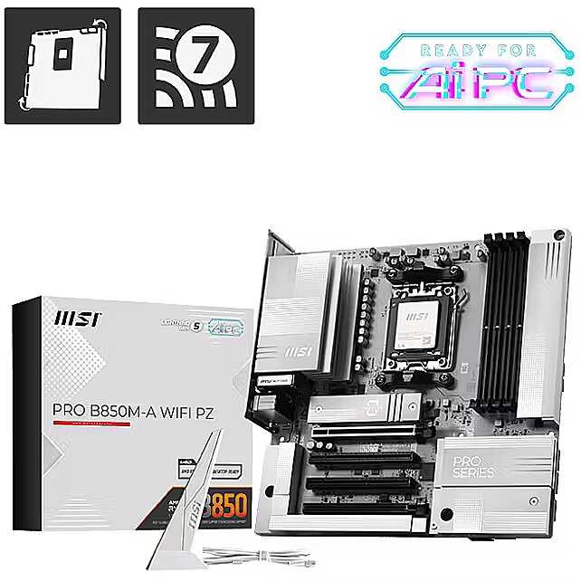 LongDesc - PRO B850M-A WIFI PZ offers a sleek design with a harmonious silver-white color scheme that perfectly matches white PC builds. Its innovative back-connect design reduces the complexity of cable management, resulting in an aesthetically pleasing appearance for the system. It is engineered with many exclusive features of MSI, Wi-Fi 7 with EZ Antenna, 5G LAN, PCIe 5.0 M.2, and Supplemental PCIe Power, ready for the AMD Ryzen™ 9000 series processors.The PRO Series is tailored to professionals from all walks of life. The lineup features impressive performance and high quality, while aiming to provide users incredible experience. Users who care about productivity and efficiency can definitely count on the MSI PRO Series to assist you with multitasking and increasing efficiency.MSI motherboards are designed with advanced hardware and technology, well-supporting the demanding computing usage of gaming and AI. Moreover, we also introduce AI to MSI Center and BIOS, making everything more effortless than before.Back-Connect DesignThe PRO B850M-A WIFI PZ features a back-connect design, which relocates the motherboard power, CPU power, fan pins, SATA, and other interfaces to the back of the motherboard. This allows for simpler cable management, while also providing a cleaner and more aesthetically pleasing appearance for the system.One Finger for EZ GPU InstallationThe new EZ PCIe Clip II, located on the first slot, features the rebounding force mechanism that allows for easy removal of the graphics card by pressing the tail-like lock with one finger. Due to this exquisite design, users can uninstall the graphics cards effortlessly, even in the cramped case spaces.The Pre-Installed I/O Shield offers a streamlined and hassle-free installation experience by eliminating the need to manually fit the I/O shield during motherboard setup. With its built-in design, it ensures proper alignment and a secure fit, providing both protection and convenience while enhancing the overall durability of your build.MSI EZ Antenna makes the process effortless by simply attaching fasteners to the motherboard without rotation.Onboard LEDs will indicate the source of the problem so you know exactly where to look to get up and running again.This LED lights up when it detects faulty memory in slots, eliminating guesswork from troubleshooting.DIRECT 8+2+1 POWER DESIGNUnleash and sustain the maximum performance with a VRM design built with a total of 8+2+1 digital power phases. With 8+4-pin power connectors, PRO B850M-A WIFI PZ is ready for the challenge of heavy-loading tasks.OPTIMIZED PCB SOLUTIONThe PCB design has been optimized for higher bandwidth and faster transfer speeds, which is also beneficial for reliable circuit transmission.DDR5 MEMORY SUPPORT WITH HIGH PERFORMANCEA huge step of DDR performance enhancement with the latest DDR5 memory. Combines with dedicated SMT welding process and MSI Memory Boost technology, PRO B850M-A WIFI PZ is ready to deliver the world class memory performance.Transient Voltage Suppressors (TVS)Transient Voltage Suppressors (TVS) are safety devices used to protect against excessive voltage. All motherboard models of MSI are equipped with TVS. When the voltage abnormally rises, the TVS switches from a high-resistance state to a low-resistance state, diverting the excessive voltage to ground. This helps prevent circuit damage caused by high voltage.DIY 2.0 – INTEGRATING WITH THE SYSTEM ENVIRONMENTConnect and synchronize with MSI coolers and cases with strategically positioned pin-header locations including a dedicated pump-fan header.Cooling Wizard serves as a comprehensive solution for managing fan settings across all MSI products. It ensures superior cooling performance and noise reduction for your gaming PC, offering compatibility with PWM/DC fans and pumps, customizable options, and intuitive temperature monitoring for optimal operation with one click.HIGH-BANDWIDTH AND LOW-LATENCY NETWORKMSI's premium network solution provides incredible data transfer speed for demanding users.THE NEXT GEN WI-FI SOLUTION – WI-FI 7Wi-Fi 7 is the latest wireless solution that takes a huge leap forward with multiple improvements to meet the traffic demand brought and the growing number of wireless devices.AI LAN ManagerMSI AI LAN Manager automatically classifies and prioritizes the latency-sensitive applications for online games, giving you the best online gaming experience with low latency.FAST AND FUTURE-READY STORAGEMSI PRO series motherboards support all the latest storage standards, which allows users to connect any ultra-fast storage device. Start games faster, load levels faster and have a real advantage over your enemies.LIGHTNING GEN 5 PCI-E WITH STEEL ARMORSMT PCIE 5.0 SLOTThe advanced SMT(Surface Mount Technology) PCIE slot diminish interference and electrical noise, fully support the PCI-E 5.0 signal.REINFORCED,HEAVY SOLDERED CONNECTIONSMSI PCI Express Steel Armor slots are secured to the motherboard with extra solder points and support the weight of heavy graphics cards. When every advantage in games counts, Steel Armor shields the point of contact from electromagnetic interference.