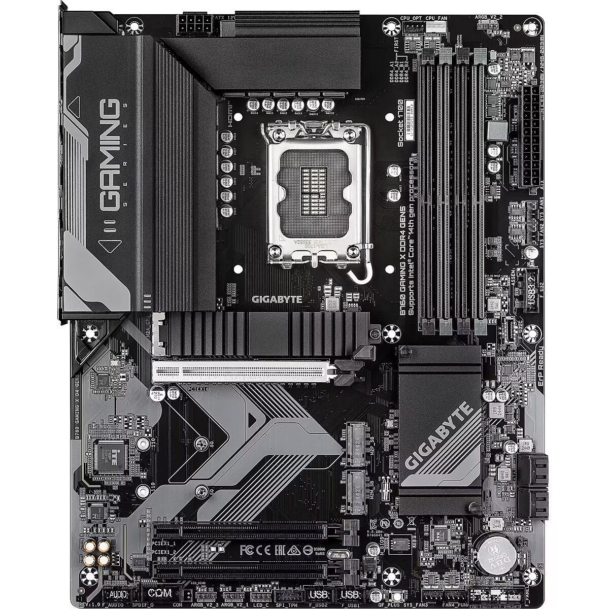 Summary - GIGABYTE B760 GAMING X DDR4 GEN5 Motherboard - Supports 14th Gen. Intel Core CPUs, 8+1+1 phases VRM, up to 5333MHz DDR4 (OC), 3xPCIe 4.0 M.2, 2.5GbE LAN, USB 3.2 Gen 2. Processor manufacturer: Intel, Processor socket: LGA 1700, Compatible processor series: Intel® Celeron®, Intel Core i3 12th Gen, Intel Core i3 13th Gen, Intel Core i3 14th Gen, Intel.... Supported memory types: DDR4-SDRAM, Maximum internal memory: 128 GB, Memory slots type: DIMM. Supported storage drive interfaces: M.2, PCI Express 4.0, SATA III, Supported storage drive types: HDD & SSD, RAID levels: 0, 1, 5, 10. Maximum resolution: 4096 x 2304 pixels. Ethernet interface type: 2.5 Gigabit Ethernet, LAN controller: Realtek RTL8125