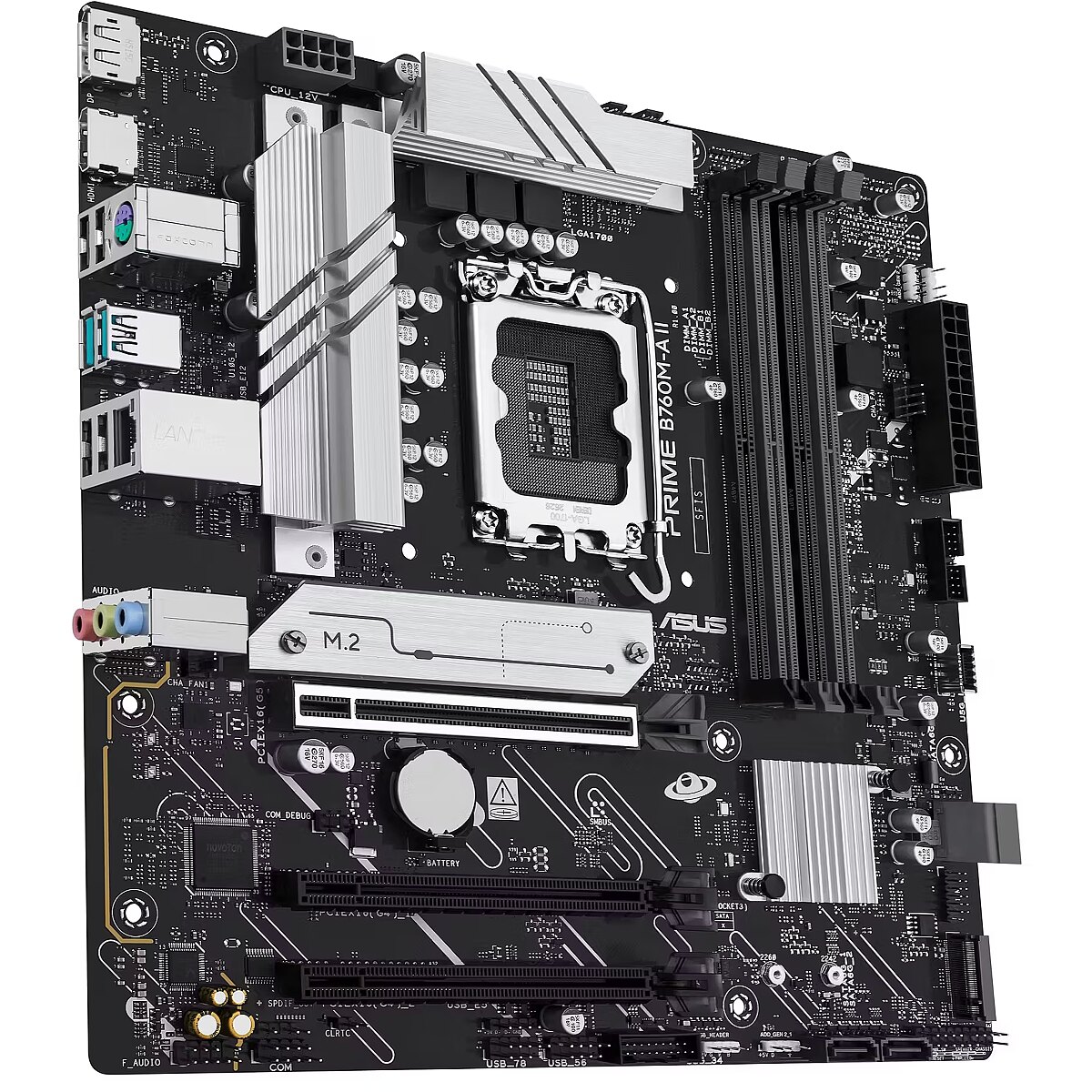LongDesc - ASUS Prime series motherboards are expertly engineered to unleash the full potential of 14th Gen Intel® Core™ Processors. Boasting a robust power design, comprehensive cooling solutions and intelligent tuning options, PRIME B760M-A II-CSM provides users and PC DIY builders with a range of performance optimizations via intuitive software and firmware features. This platform delivers the power and connectivity that advanced AI PC applications demand.ASUS Corporate Stable ModelASUS Corporate Stable Model (CSM) is a commercial program designed to provide stable and reliable motherboards. Offering up to 36-month product lifecycle support and 6-month end-of-life notice to allow sufficient lead times for your organization to get ready for product transitions. Each purchase of an ASUS CSM motherboard comes with ASUS Control Center Express - server-grade IT management software.* Lifecycle support, program offering and supply status may vary by region. Please consult your local sales representative for more information.ASUS ControlCenter ExpressASUS Control Center Express is an integrated IT monitoring and management software designed to deploy faster, simplify IT operations and improve productivity with comprehensive control and user-friendly functions. ASUS Control Center Express is compatible with over 100 ASUS motherboards to provide a high-quality, TCO-optimized solution for your business needs.Optimize IT endpoint managementDesigned to assist IT staff in monitoring and controlling devices within their corporate networks, and facilitate inventory checking in multiple locations remotelyAutomate IT maintenanceAllows IT staff to schedule automatic updates of the latest BIOS, software and utilities to specific or all devices at off-peak times, enhancing system stability and IT operational flexibilitySecurely manage all of endpointsSecurely manage endpoint configuration, portable storage access and PC software applications by enabling them to create grouping rules on individual devicesFLEXIBILITYComprehensive controls form the foundation of the ASUS PRIME series. The PRIME B760 motherboard packs flexible tools to tune every aspect of your system, enabling performance tweaks to perfectly match the way you work to maximize productivity.Intelligent ControlASUS Intelligent Control makes your PC smart. Along with taking care of complex tuning and dynamically optimizing essential aspects of your system, it offers intelligently simplified options for newcomers to PC DIY, as well as more comprehensive features for seasoned veterans.Flexible Air- and Liquid-Cooling ControlsASUS Fan Xpert 2+ software provides comprehensive control over fans and all-in-one (AiO) coolers. Whether cooling with air or water, an Auto-Tuning mode intelligently configures all parameters with a single click. There’s also an Extreme Quiet mode that reduces chassis fan speeds to below the default minimum to keep your system whisper-quiet when performing light tasks. Fans, AiO coolers can also be controlled via the UEFI BIOS.Precise Digital Power ControlThe Digi+ voltage-regulator module (VRM) delivers real-time control over voltage droop, automatically switching frequency and power-efficiency settings. It also allows you to fine-tune your CPU for ultimate stability and performance.UEFI BIOSThe renowned ASUS UEFI BIOS provides everything you need to configure, tweak and tune your system. It offers intelligently simplified options for PC DIY beginners, as well as comprehensive features for seasoned veterans.Advanced Tuning for Serious TweakersAn intuitive Advanced mode offered via the UEFI lets you take complete control. A built-in search feature makes it easy to find options, and various advanced functions let you intelligently make nuanced adjustments so you can dial in performance just the way you want.Quick and Simple SetupEZ mode displays vital settings and stats and also offers guided wizards, drag-and-drop functionality, and one-click application of important settings — all to help you get your rig up and running in no time.Intuitive Graphical Fan ControlFine-tune individual fan settings simply by dragging a curve with the mouse.Aura On/Off Mode (Stealth)Easily enable or disable Aura RGB lighting or every onboard LED, for a subdued aesthetic touch.COOLINGPRIME B760 series are engineered with multiple onboard heatsinks and an array of hybrid fan headers to ensure your rig stays cool and stable under intense workloads.HeatsinksM.2 HeatsinkM.2 heatsink wards off throttling that can occur with M.2 storage during sustained transfers. The heatsink is held in place by captive screws, and these removable captive screws help reduce risk of drops or loss during heatsink removal.VRM Heatsinks and Thermal PadsVRM heatsinks and thermal pads improve heat transfer from the MOSFETs and chocks for better cooling performance.Cooler by DesignPRIME B760 series features comprehensive cooling controls that are configurable via Fan Xpert 2+ software or via the UEFI BIOS.Multiple Temperature SourcesEach header can dynamically reference three thermal sensors. Fan Xpert 2+ allows you to map the temperature of supported ASUS graphics cards to optimize cooling for GPU- and CPU-intensive tasks.Smart ProtectionA dedicated integrated circuit protects each fan header from overheating and overcurrent.4-Pin PWM/DC FanEach onboard header supports auto-detection of PWM or DC fans.PERFORMANCEThe PRIME B760 series are built to handle the high core counts and bandwidth demands of 14th, 13th and 12th Gen Intel® Processors. ASUS B760 motherboard provides all the fundamentals to boost daily productivity, so your system will be ready for action with stable power, intuitive cooling and flexible data transfer options.Robust Power DesignStable power is essential to extract every last bit of performance out of Intel® processors. The PRIME B760M-A II-CSM is geared to cater to the demands of these high-core-count CPUs.ProCool ConnectorProprietary connectors