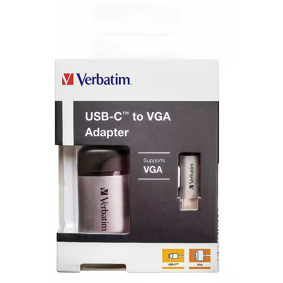 LongDesc - Seamless connectionThe Verbatim USB-C to VGA adapter lets you connect your USB-C or Thunderbolt 3 (USB-C) enabled laptops and MacBooks to a VGA display. It is the ideal companion for the latest slimline laptops and MacBooks that come with limited ports. No need to replace your whole setup when you upgrade your laptop, simply connect the adapter to a USB-C port on your laptop and then plug in your TV, projector or monitor's VGA connector.Full HD experienceThe USB-C to VGA adapter delivers the full HD experience on a VGA display or projector. You won’t compromise picture quality when using this adapter which supports resolutions of up to 1080p. It harnesses the video capabilities that are built into the USB-C connection to deliver every detail in high definition.Portable convenienceThis ultra-portable design makes this adapter perfect for BYOD (Bring Your Own Device) applications at the office and when travelling. Being highly compatible with existing VGA output displays means you can work almost anywhere!