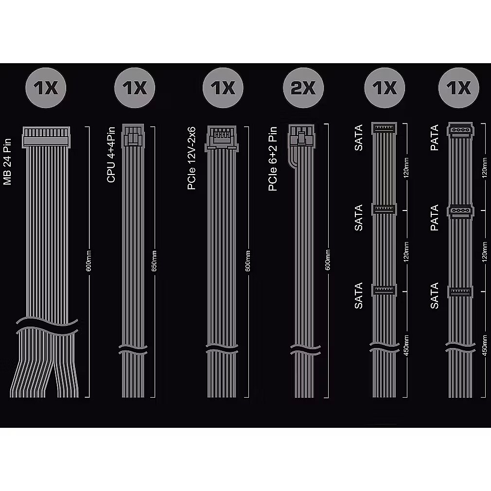 This 850W power supply unit is intended for a workstation or high-performance gaming computer. It will be able to power multiple hard drives (SSD/HDD), water cooling, a high-end graphics card (for example, RTX 4070 Ti SUPER), and a top-tier processor (possibly overclocked).