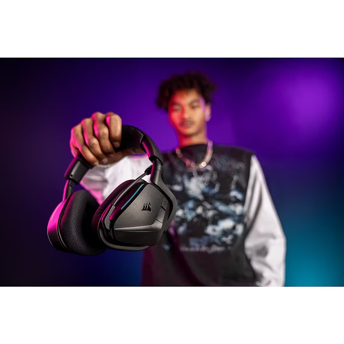 Description - Headset Void Wireless 2.0  Dolby Atmos Spatial Audio: Experience dynamic and directional audio that lets you pinpoint every footstep, explosion, and movement with incredible directional accuracy. Ultra-fast 2.4GHz wireless or Bluetooth: Stay connected with low-latency 2.4GHz wireless for high-performance gaming and Bluetooth for added versatility. Instantly switch between connections with the press of a button. Dynamic Drivers for Superior Audio: Custom-tuned 50mm drivers deliver dynamic and high-fidelity soundscapes, making every soundtrack, effect, and in-game moment more impactful. Dual Wireless Compatibility: Effortlessly switch between PC, PlayStation, Nintendo Switch, and Mobile for premium audio with the press of a button.   Long-Lasting Battery: Play for days with up to 70 hours of battery life. When youre running low, a 15-minute charge provides up to 6 more hours of battery. Comfort You Can Count On: Stay cool and comfortable during long gaming sessions with memory foam ear cushions wrapped in breathable microfiber fabric. Crystal-Clear Communication: The omni-directional microphone with NVIDIA Broadcast technology cuts through background noise, ensuring your team hears you clearly. Custom Audio and Lighting: Take control of your sound and style with CORSAIR iCUE. Customize EQ settings, load pre-tuned profiles, and personalize RGB lighting.