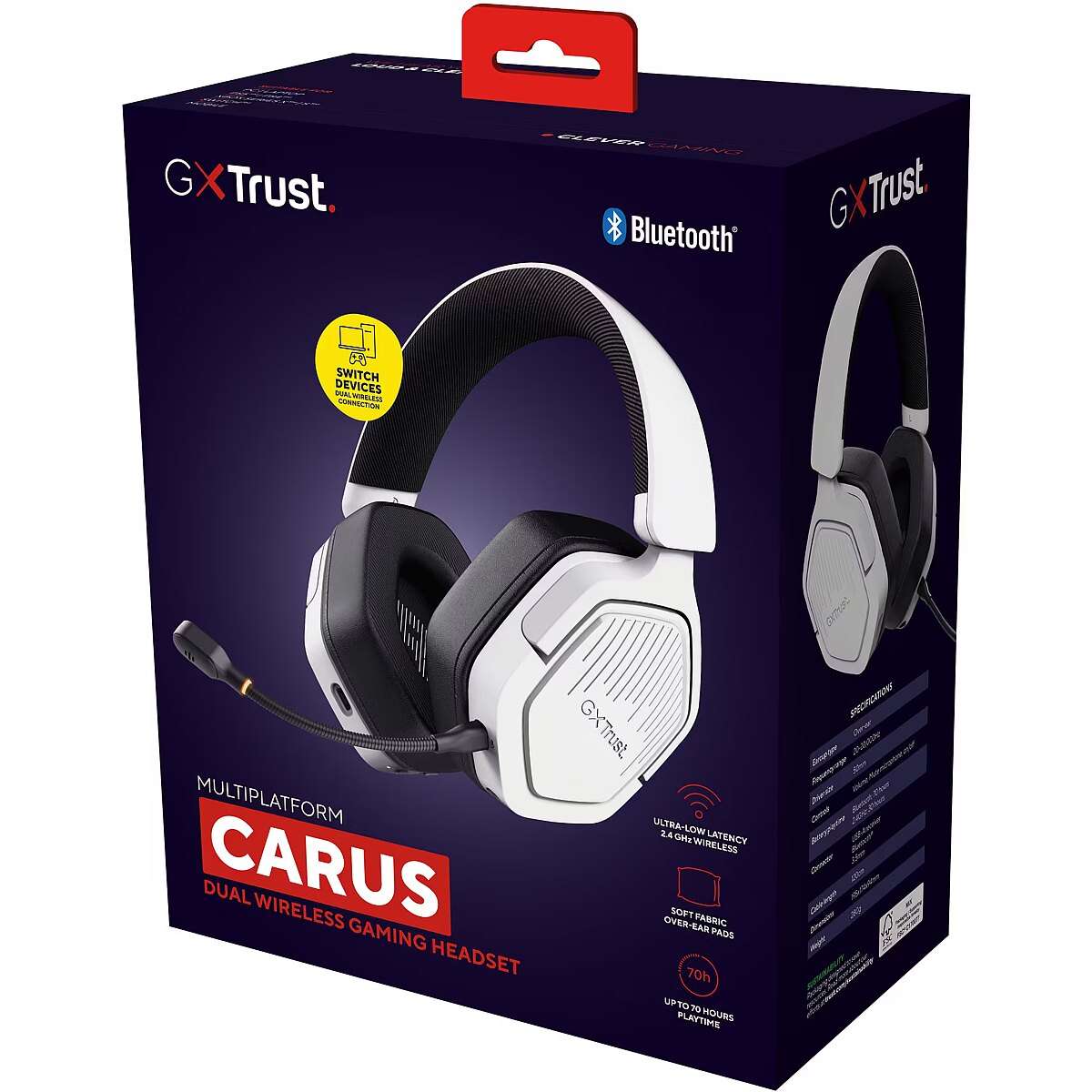 LongSummaryDescription - Trust GXT 493W Carus. Product type: Headset. Connectivity technology: Wired & Wireless, Bluetooth. Recommended usage: Gaming. Headphone frequency: 20 - 20000 Hz. Weight: 280 g. Product colour: White