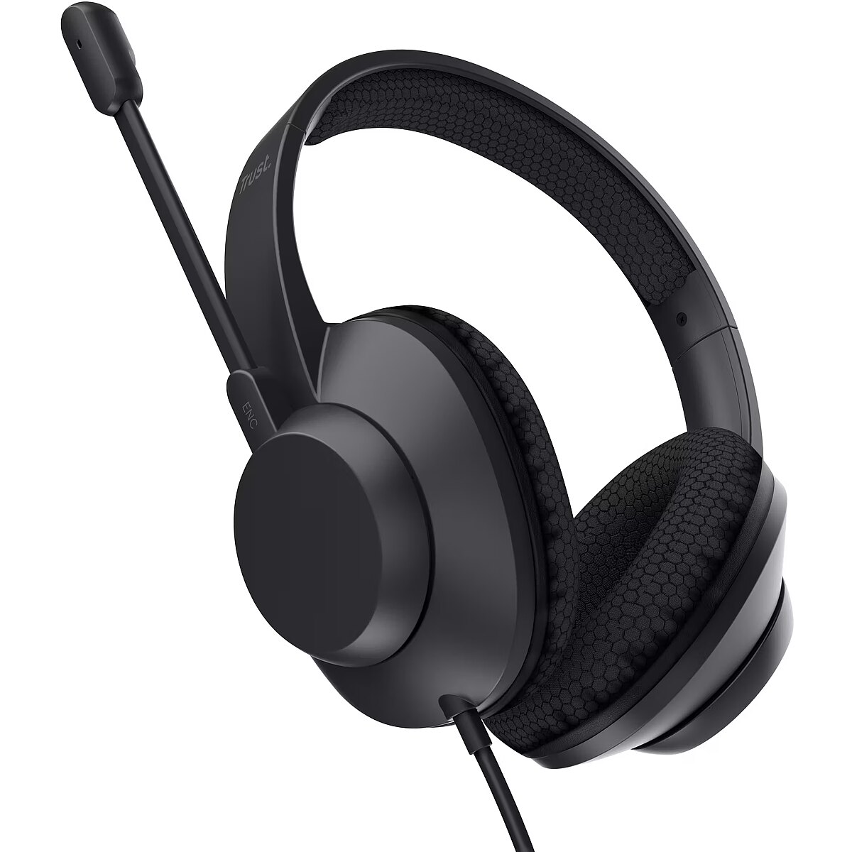 Features and functionality: Manufacturer: Trust Model: Ayda Max Connection: USB-C with USB-C → USB-A adapter Type: over-ear headphones Microphone: flexible with ENC to reduce background noise Volume control: on-ear dial Materials: PU leather ear pads, adjustable headband, ABS plastic housing Cable length: 1.8 m Plug & Play: simple connection without drivers Compatibility: Windows, macOS, Linux Color: black Weight: 0.167 kg Ergonomics: comfortable for extended use Sustainability: housing made of 85% recycled materials Special features: ideal for work, video conferencing, study, online gaming, and calls Specifications: Model: Ayda Max ENC: yes Cable length: 1.8 m Weight: 0.167 kg Color: black Package contents: Trust Ayda Max USB Headphones USB-C → USB-A adapter User manual