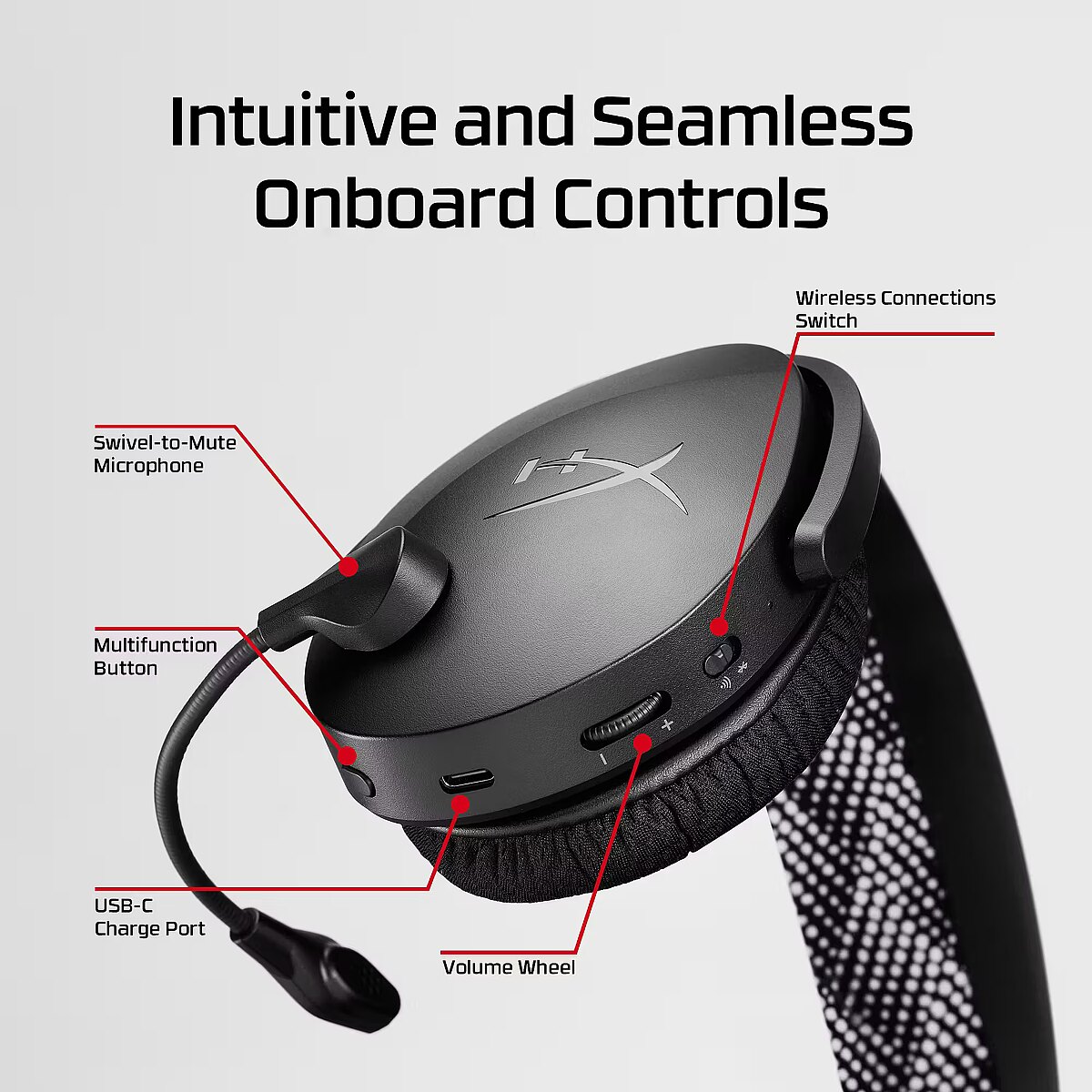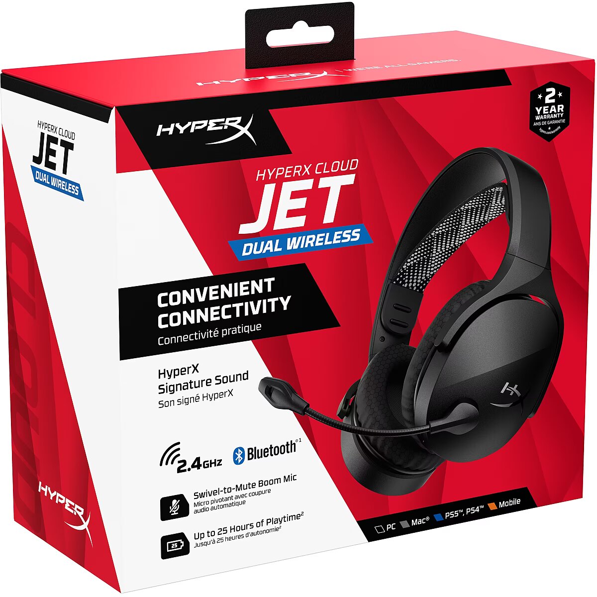 LongDesc - Sleek Design. Enhanced Experience.Designed for both rising gamers and those upgrading from entry-level gear, the HyperX Cloud Jet dual wireless headset offers a seamless experience with 2.4GHz and Bluetooth 5.3 connectivity. Effortlessly switch between PC, console, and mobile devices while enjoying rich audio delivered by 40mm drivers for an immersive gaming experience. Stay connected with a swivel-to-mute boom mic that ensures clear communication with your squad. With up to 25 hours of battery life[1], you can dive into longer gaming sessions without interruptions. The onboard controls make it easy to adjust the volume, mute the mic, and toggle between connections. Plus, its lightweight design, breathable mesh earpads, and elastic suspension headband provide ultimate comfort for marathon gaming. Elevate your gaming experience with the HyperX Cloud Jet!
