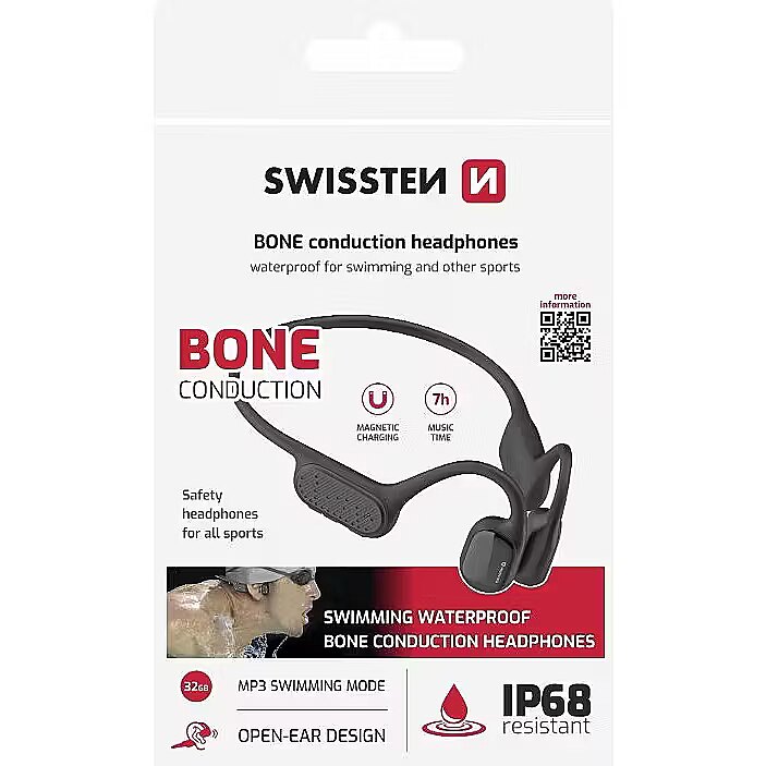 description_en - Premium SWISSTEN Bone Conduction Bluetooth headphones are designed for swimmers, triathletes, and outdoor enthusiasts who want to enjoy music in any environment – from the swimming pool to the running track. With bone conduction technology, you can enjoy music even underwater without blocking your ears, all while staying aware of your surroundings. The IP68 rating ensures complete protection against water and dust, so you don’t have to worry about long training sessions in the water. The premium silicone material fits comfortably, doesn’t cause pressure, and resists sweat, chlorine, and saltwater. A major advantage is the built-in 32GB memory, allowing you to easily upload music directly from your phone via the magnetic charging connector – no computer required. The package includes two magnetic charging cables (in case one is lost), swimming earplugs, an adjustable strap for smaller head sizes, and a USB-C/USB-A adapter for quick music transfer from your smartphone. Bone Conduction Technology
