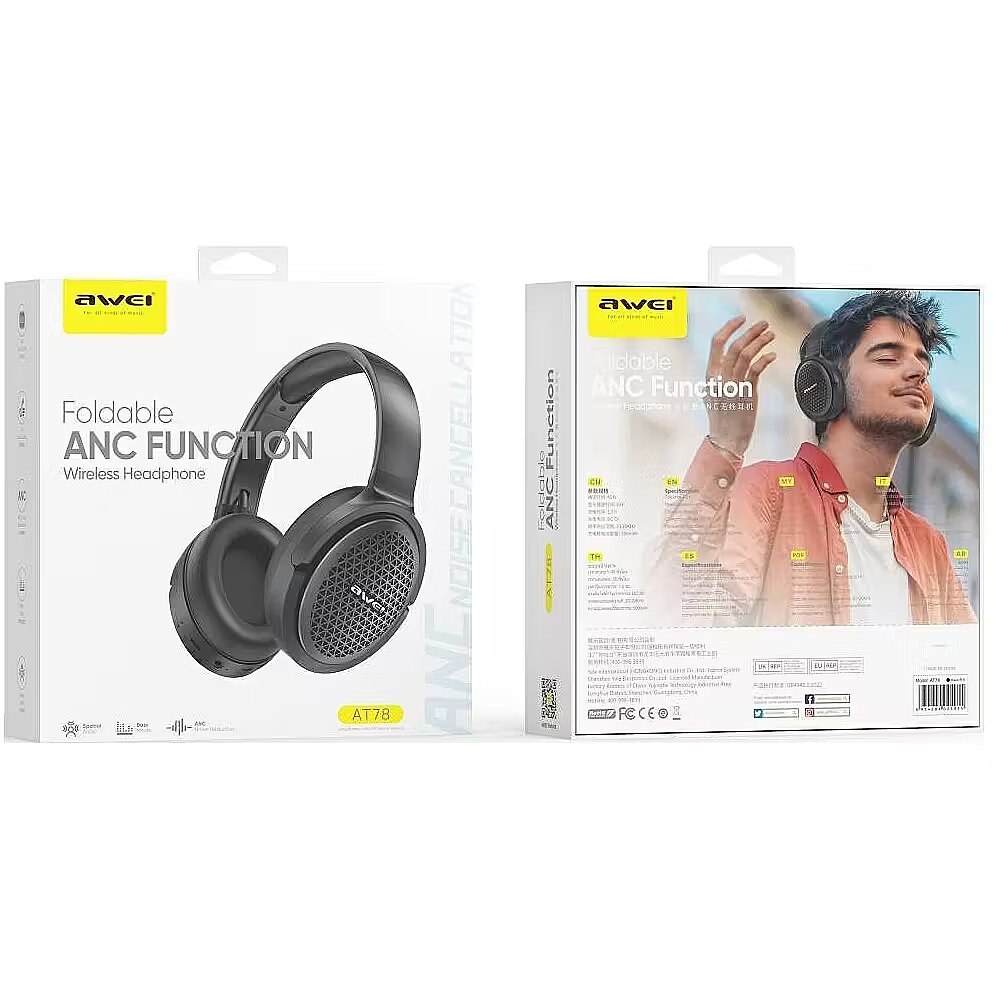 Description - Awei AT78 Wireless Earbuds Awei AT78 is a modern, wireless on-ear headphones designed for users who expect high comfort, good sound quality and long battery life. This model combines elegant appearance with functionality, offering solutions found in more expensive audio devices. The headphones are equipped with the Bluetooth 6.0 module, which provides a fast and stable connection to the phone, tablet or computer. The transmission range is up to 10 meters, which allows you to freely use them without having to keep the source device at your fingertips. Large, 40-millimeter transducers guarantee a rich, spatial sound with a strong bass and clean high tones, and the ANC (active noise reduction) technology used effectively eliminates ambient sounds, so you can fully focus on music or conversation. The AT78 also features an ENC system that reduces microphone noise during voice calls, providing clear and clear talk sound. The battery with a capacity of about 500 mAh allows you to listen to music for up to 50 hours or have conversations for 45 hours without having to charge. The full charging time is about 1.5 hours, and charging is done using the USB-C port. The design of the headphones is ergonomic and foldable, which makes them easy to carry. Soft earmuffs made of pleasant to the touch material and adjustable headband provide a high level of comfort even during long use. The whole is made of solid materials, and the aesthetic finish makes the headphones look stylish and modern. Awei AT78 is the perfect choice for people who are looking for universal headphones for everyday use for work, study, travel or relaxation with their favorite music. Long operating time, effective noise reduction and attractive price make them one of the most interesting proposals in the segment of budget wireless headphones.