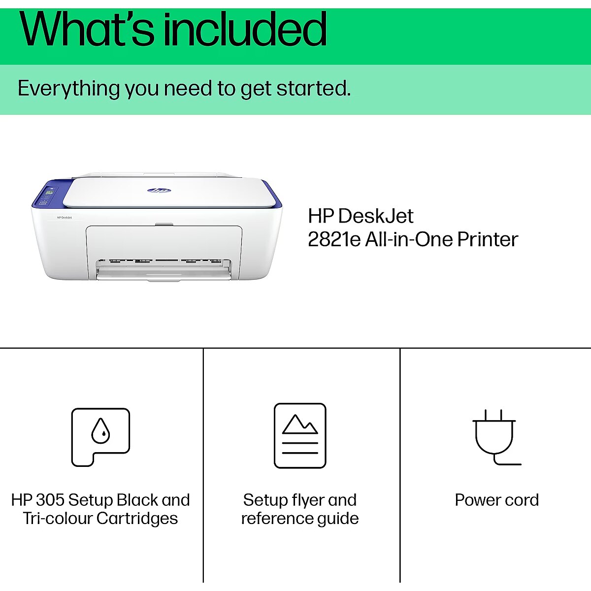 Technical details - Box contents - HP DeskJet 2821e All-in-One Printer; HP 305 Setup Black Cartridge (~120 pages yield); HP 305 Setup Tri-Color Cartridge (~100 pages yield); Regulatory flyer; Setup guide; Reference guide; Power cord [For ink volume and page yield information, visit http://hp.com/go/learnaboutsupplies]