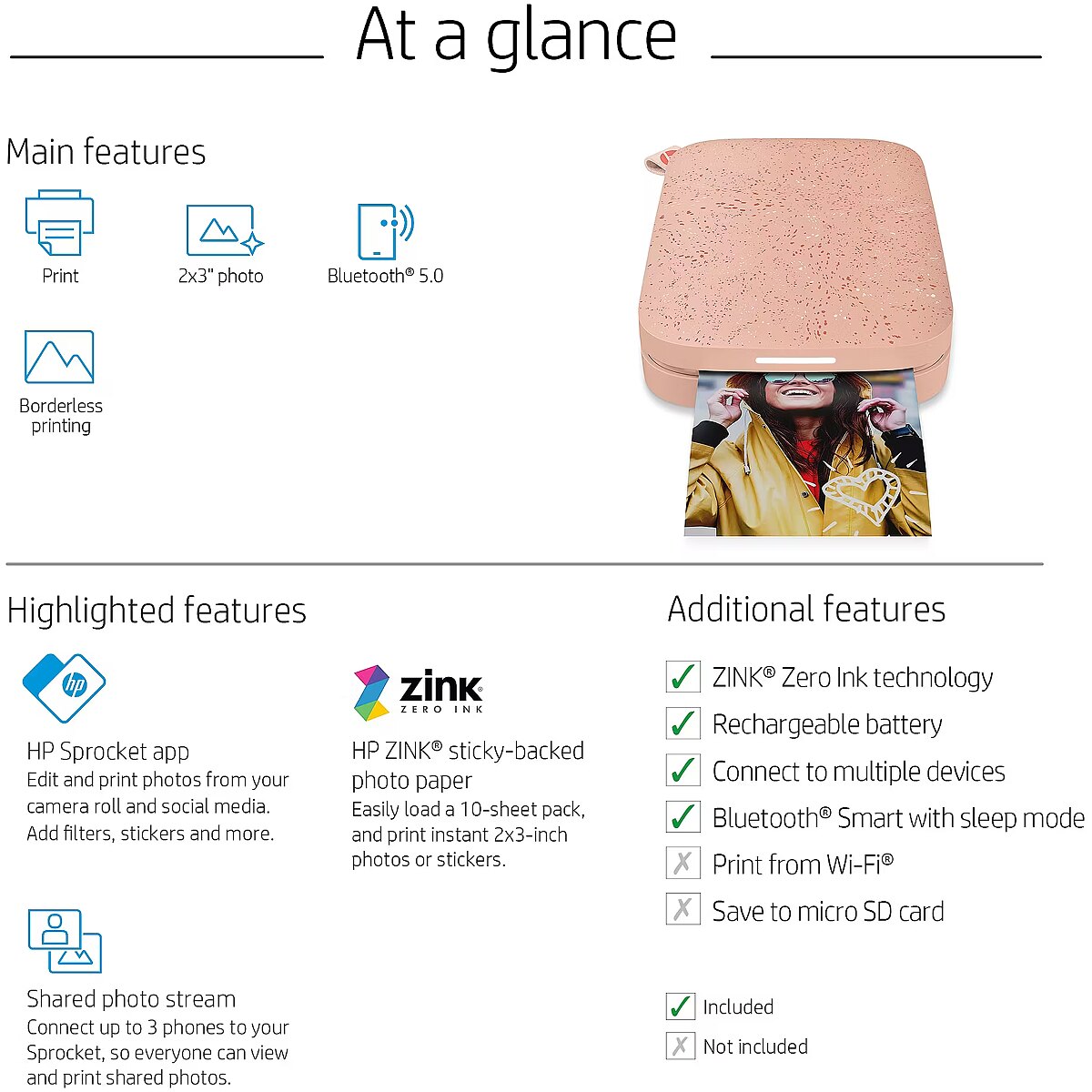 LongProductName - HP Sprocket 200 Printer, ZINK, 2"x 3" (5.08x7.6 cm), 313 x 400dpi, 550mah, Li-Polymer(LiPo), 40s, 64MB, Bluetooth 5.0