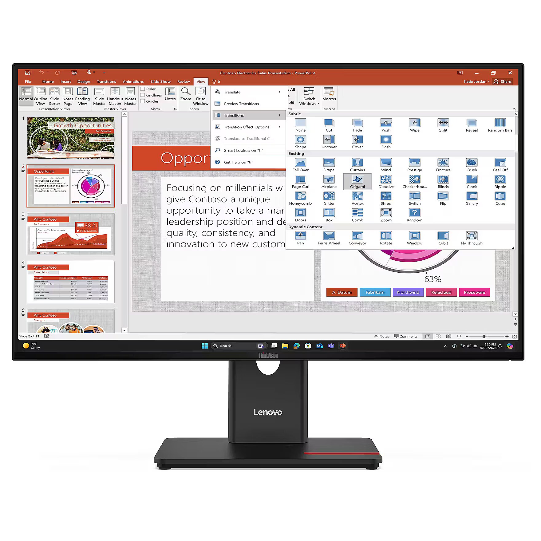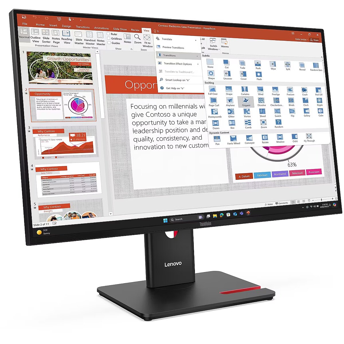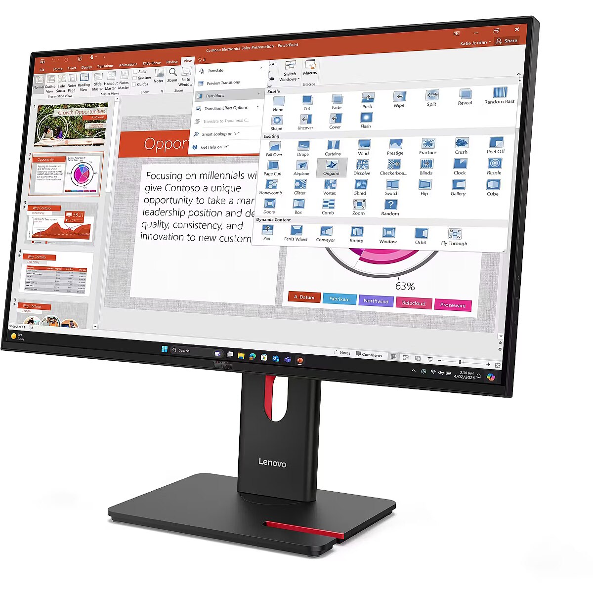 LongDesc - ThinkVision T27-40 Monitor's a 27-inch FHD IPS screen with wide color gamut of 99% sRGB and 99% BT.709 which deliver vivid image at any viewing angle. Match your screen to your workflow with 48-120 Hz dynamic refresh rate. It dynamically adjusts to match on-screen content, resulting in smoother motion for fast moving pictures or reduced rates for power saving when viewing still images. It’s built with a 4-sided ultra thin bezel display, fewer distractions when you are viewing, more of what needs to be seen. Integrated Natural Low Blue Light technology protecting your eyes from fatigue even during long hours at work. In addition, TÜV Rheinland Eye Comfort 5 stars certification ensure the toxic blue light is significantly reduced ever than before. Endless list of devices compatible with the connectivity hub, including VGA, DP 1.2, HDMI 1.4, three USB-A 3.2 plus one USB-C (15W) downstream ports, one USB-B 3.2 upstream port support peripherials control and data transimission. You can adjust the monitor for a more convenient and enjoyable viewing experience with the ergonomic stand’s tilt, lift, swivel, and pivot functions.This monitor packs a world of features without impacting the environment by following the latest TCO 10.0, EU Energy Level, Energystar 8.0 regulations.