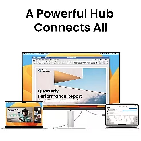 USB Power Delivery provides device charging directly from the monitor, reducing the need for separate power blocks. It simplifies device placement and reduces the number of wires. Parallel charging and signal transmission makes the connection more functional and versatile.