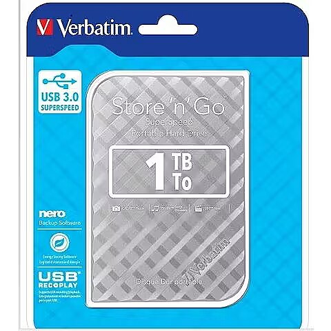 LargeDescHTML - Product SummaryThe Verbatim Store n Go portable hard drive features high performance storage using a USB 3.0 “Super Speed” interface. USB 3.0 offers up to 10 times faster data transfer rates than USB 2.0 (based on USB bus speed) providing ultra fast data transfer on the go.Store and carry your digital and day to day working files on this truly mobile drive. Its stylish design sits neatly on the modern desk top as the perfect accompaniment to your laptop.Store n Go portable hard drive is USB 3.0 bus powered (1 x USB 3.0 interface) yet is backwards compatible to any USB 2.0 ports on your PC or notebook. The drive requires no external power for operation; simply plug n play.Store 'n' Go Portable Hard Drives are formatted in FAT32 enabling you to use them on Windows OS and Mac OS systems.For added security Nero Backup software is provided to help back up your laptop or PC's hard drive. Backup provides an application to back up all your files, folders, and drives whenever you want, or schedule the auto back up to a set time for added security.Nero Backup Software is compatible with Windows XP, Vista, Windows 7 and Windows 8 (not compatible with Mac OS).Verbatim Store 'n' Go Portable Hard Drives also come with Green Button energy saving software. Green Button software suspends the hard drive from spinning while not in use increasing efficiency and saving energy.There are 3 'Sleep Setting' options. Set the suspend mode to come in after 10 minutes of use, or by increments of 10 minutes up to 120 minutes. Set the drive to suspend immediately by double clicking the Green Button icon on the desktop, alternatively you can set the drive to 'Never Suspend the disk'This range of Hard Drives is available in 5 colours: Black, Silver, Blue, Red and White.Verbatim 2 Year Limited Warranty
