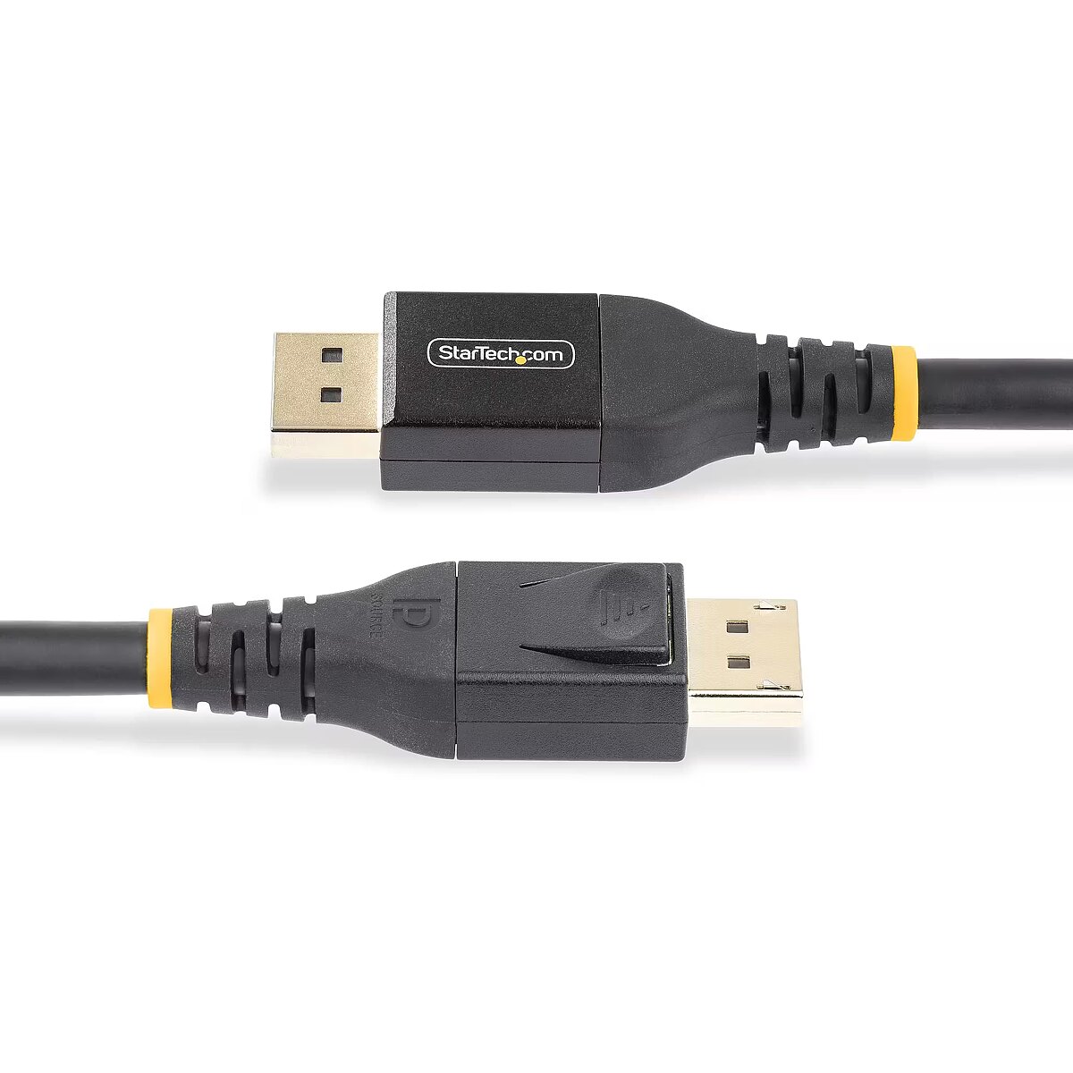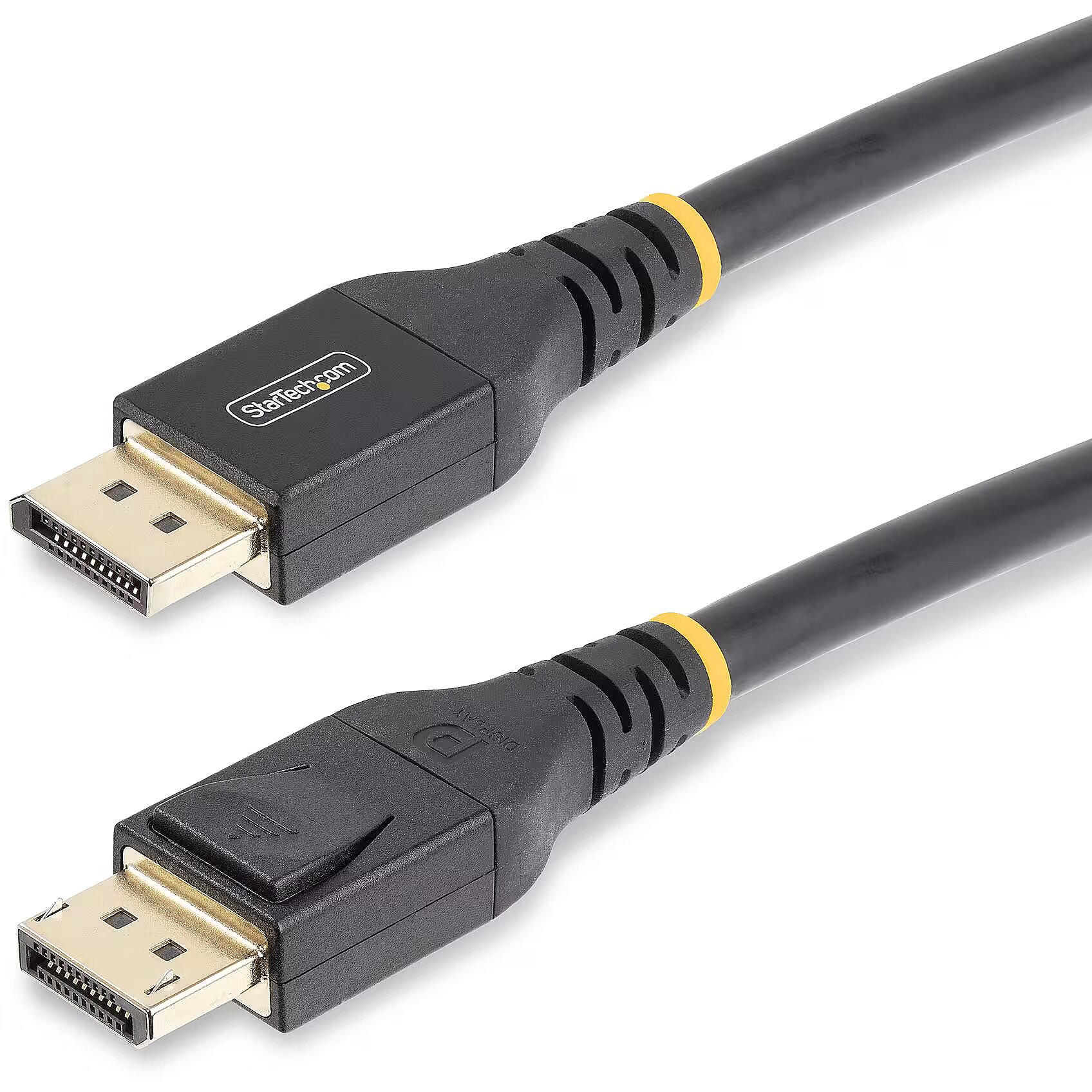 LongDesc - Facilitate a longer 8K connection without requiring an external power sourceConnect a 4K/8K DisplayPort 1.4-enabled monitor to a source or MST-enabled hub, using this Active DisplayPort 1.4 Cable. The active signal booster ensures reliable audio and 8K video output at up to 50ft (15.2m) without a DisplayPort repeater and external power source. This active DP 1.4 cable is unidirectional with conveniently labeled connectors for source and display to simplify setup.Durable DesignThis long DisplayPort cable features a flexible TPE outer jacket to reduce wear from corner bends and long cable runs. Robust strain reliefs enable soft and flexible bends, for convenient positioning of the cable. The latching DP connectors are gold plated for improved conductivity and anti-tarnish properties, and attaches securely to the device to prevent accidental disconnection.Supported DisplayPort 1.4 Features:This 8K DisplayPort cable supports all DP 1.4 features:• Resolutions up to 8K 60Hz, 4K 120Hz, 1440p 240Hz with a compatible DP source and display• HDCP 2.2 support• High Bit Rate 3 (HBR3) bandwidth of 32.4Gbps• High Dynamic Range 10 (HDR10)• Display Stream Compression 1.2 (DSC 1.2)• Multi-Stream Transport (MST) for daisy-chaining multiple monitors• 32 Uncompressed Digital Audio Channels• Backward compatible with 5K 60Hz, 4K 120Hz and previous DP versionsThe Active DP Cable is constructed with aluminum-mylar shielding to minimize EMI interference for clear and reliable audio/video output. This DP cable is designed for long-term reliability, and is the ideal solution for setting up boardrooms, video walls, and TV signage.The StarTech.com Advantage