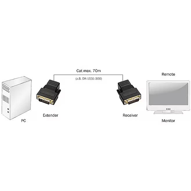 The DVI extender enables the transmission of DVI signals up to 70 meters using CAT5 cables as a transmission medium. The resolution depends on the length of the transmission path.