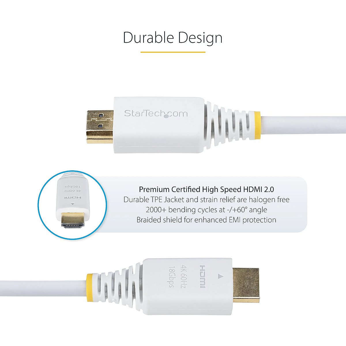 LongDesc - Connect reliably between HDMI UHD devices using this Premium Certified HDMI CableConnect to a 4K UHD TV or monitor, using this Premium Certified HDMI 2.0 Cable. The connector markings enable quick visual identification, distinguishing this cable from other similar-looking or unmarked HDMI cables. Eliminate guesswork and always choose the appropriate cable to support full HDMI 2.0 with Ethernet capabilities.Seamless CompatibilityFor seamless operation between HDMI-enabled devices, the Premium HDMI Cable is Certified for guaranteed HDMI 2.0 performance and backward compatibility. Certified cables provide consistent, reliable performance across multiple resolutions and refresh rates.Durable DesignThis High Speed HDMI Cable features a flexible TPE outer jacket that is tested to withstand 2,000 bending cycles at -/+60 degrees, and routes easily around corners and desk edges. Robust strain reliefs enable convenient positioning of the cable. The durable Gold-plated connectors are rated to operate beyond 10,000 insertions.Supported HDMI 2.0 Features:This Certified HDMI Cable supports full HDMI 2.0 features:• Resolutions up to 4K 60Hz using a compatible HDMI source and display• Supports high refresh rates including 1440p 144Hz and 1080p 240Hz• 21:9 Aspect Ratio support for cinematic viewing experiences• High Dynamic Range (HDR10) for higher contrast ratio and vibrant picture quality• High-Bandwidth Digital Content Protection (HDCP) 2.2 for a secure connection between source and display• Audio Return Channel (ARC) for sending audio from the TV back to an AV receiver or soundbar• Up to 32 Uncompressed Digital Audio Channels• HDMI Ethernet Channel (HEC) for network connectivity over HDMI• Backward compatible with previous HDMI versionsThis HDMI 2.0 Cable is constructed with braided aluminum mylar shielding to minimize EMI for clear, consistent audio/video output and long-term reliable performance.The StarTech.com Advantage