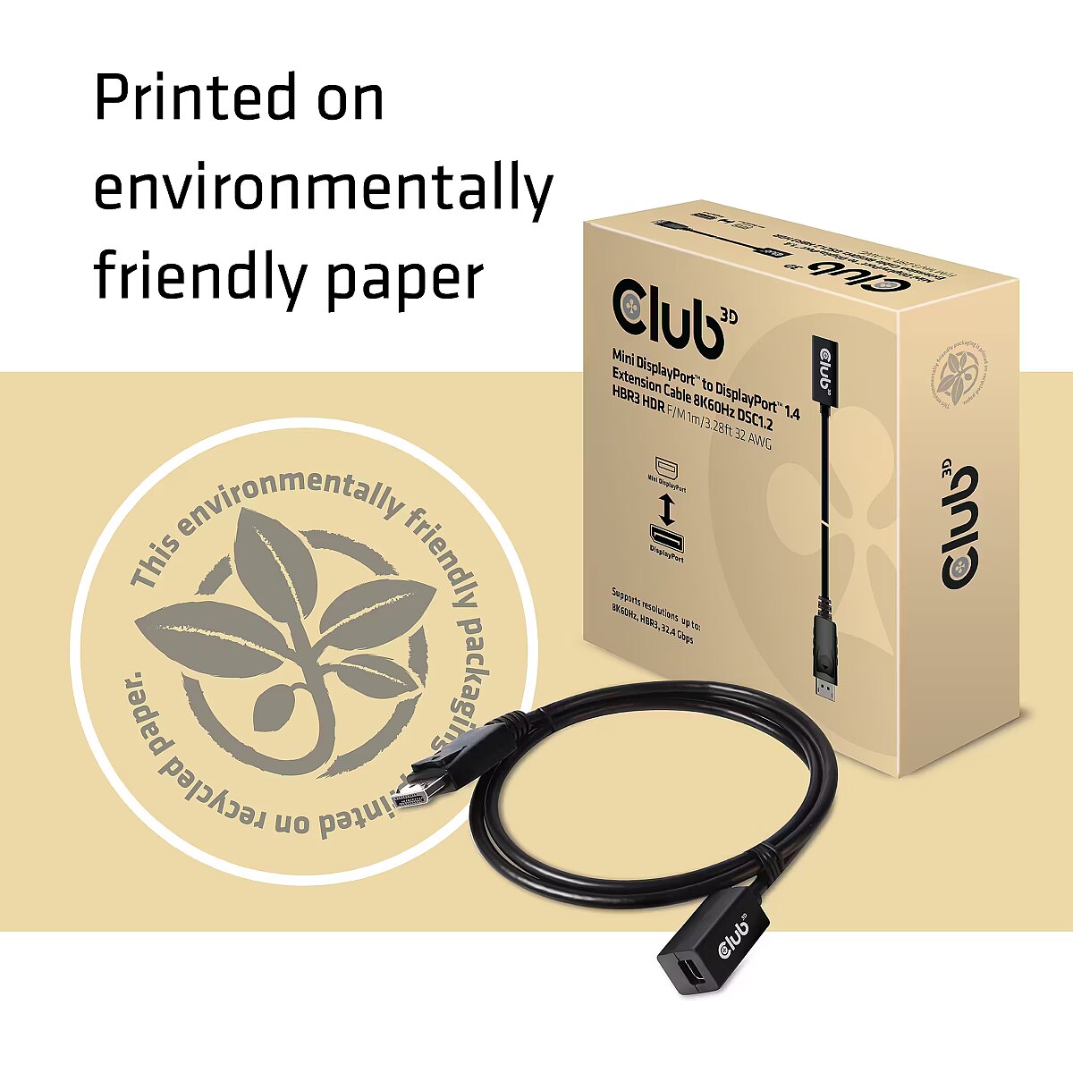 LongSummaryDescription - CLUB3D Mini DisplayPort 1.4 to DisplayPort Extension Cable 8K60Hz DSC 1.2 HBR3 HDR Bidirectional F/M 1m/3.28ft. Cable length: 1 m, Connector 1: Mini DisplayPort, Connector 2: DisplayPort. Compliance certificates: RoHS, Certification: FCC, CE EMI. Weight: 42 g. Package width: 145 mm, Package depth: 145 mm, Package height: 45 mm. Quantity per pack: 1 pc(s)