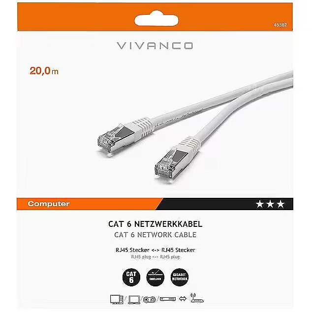 description_en - Vivanco CAT 6 network cable is a high-quality and durable solution for fast data communication in home and office networks. The cable is suitable for connecting a computer to a router or switch and supports gigabit networks, ensuring a stable and interference-free connection. F/UTP with fully insulated and cable-protected connectors improves signal quality and extends the cable's service life. 1:1 connection makes installation easy and convenient. Cat 6 F/UTP network cable Connect your computer to a router or switch Fully insulated design With RJ45 connectors Length: 20 m