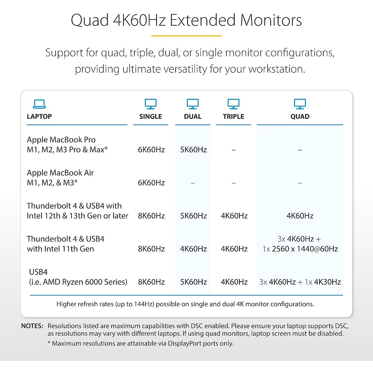 LongDesc - Universal Laptop Dock offering driverless compatibility with Windows and macOSEngineered to maximize performance and future-proof your workspace, this universal USB4 and Thunderbolt 4 dock is Thunderbolt Certified, ensuring reliable connectivity and optimal user experience.Quad Display on WindowsPush the boundaries of productivity with quad 4K 60Hz displays on Windows laptops running the latest Intel 12th Gen CPUs (or later) and DP 1.4 with DSC. Legacy systems still benefit from flexible dual or triple monitor setups.Dual Display on MacExperience dual extended 4K displays on MacBook Air and Pro powered by M3 or M4 chips (clamshell mode required for M3), and MacBook M1 / M2 Pro or Max configurations. For Apple computers featuring the M-series base processor only a single display is supported.98W Power DeliveryIncludes a fully spec'd 180W power adapter that enables the dock to charge the laptop with 98W Power Delivery, while preserving enough additional power for the downstream USB 2.0 port to support BC 1.2 with 7W (1.5A) for charging tablets, smartphones or other battery-powered USB devices.Enterprise Management ToolsStarTech.com Connectivity Tools offer practical utilities to support device management and increase productivity in modern IT environments. With features like MAC address pass-through, Wi-Fi auto switch, and USB device monitoring, the software helps IT teams streamline deployment and strengthen security across diverse setups.Visit www.StarTech.com/Connectivity-Tools to download the Enterprise Management Tools.