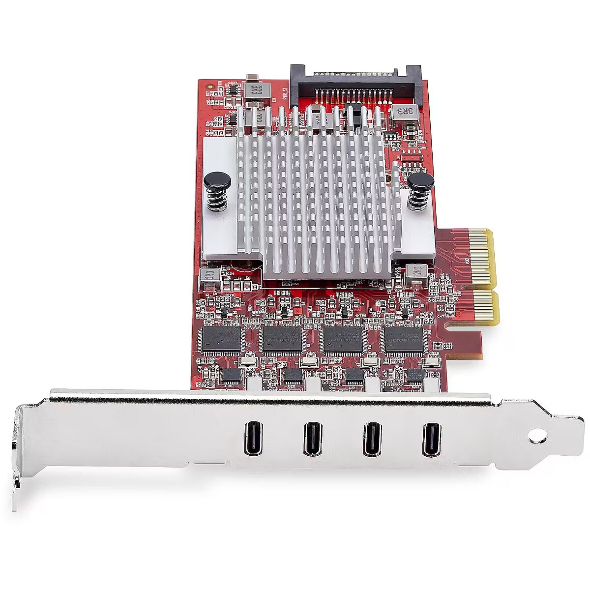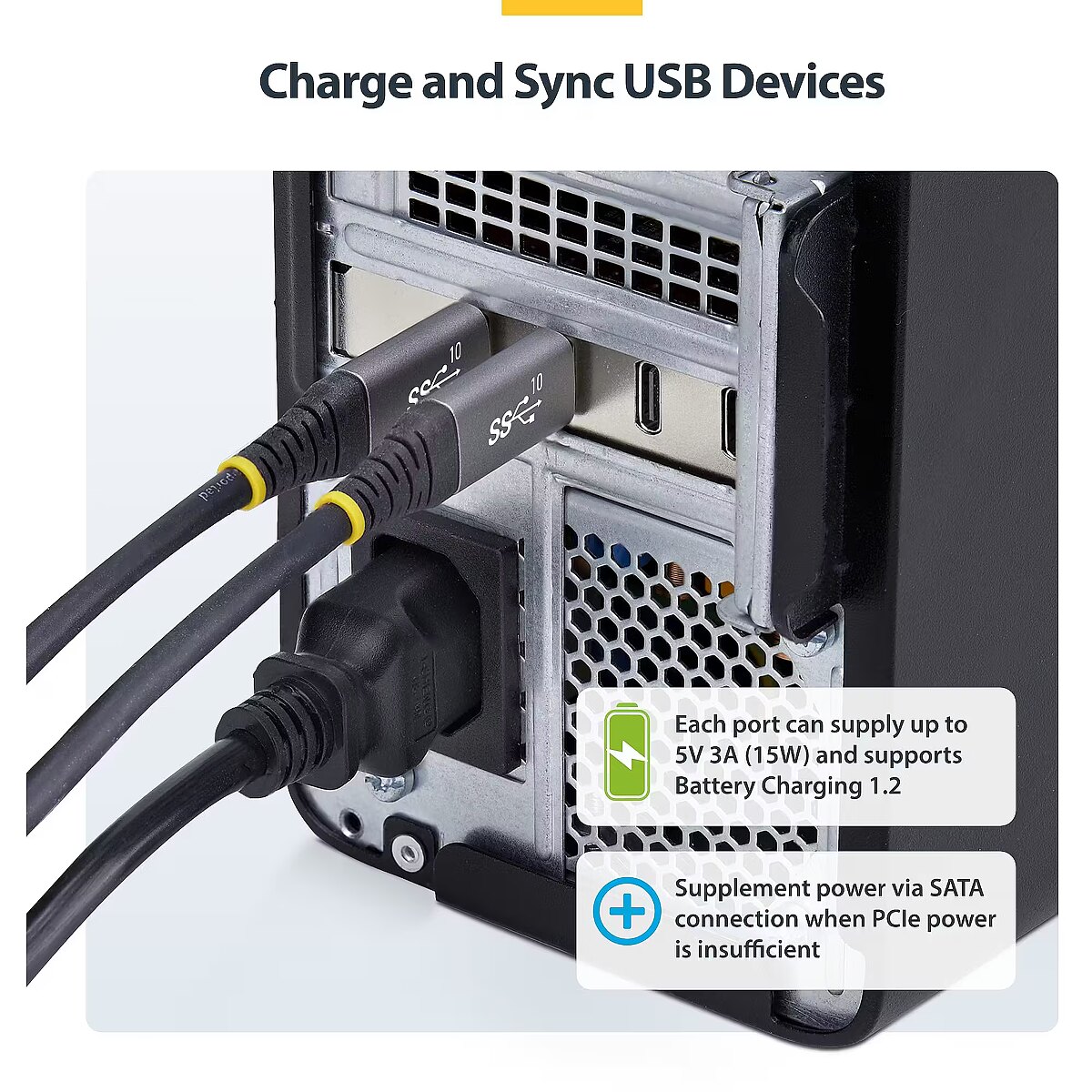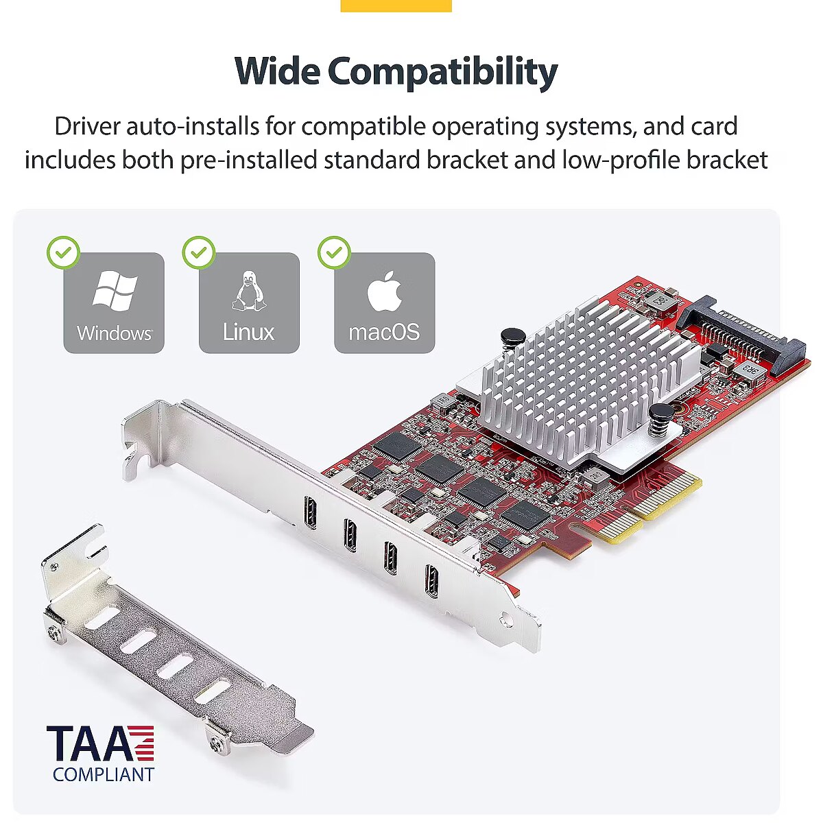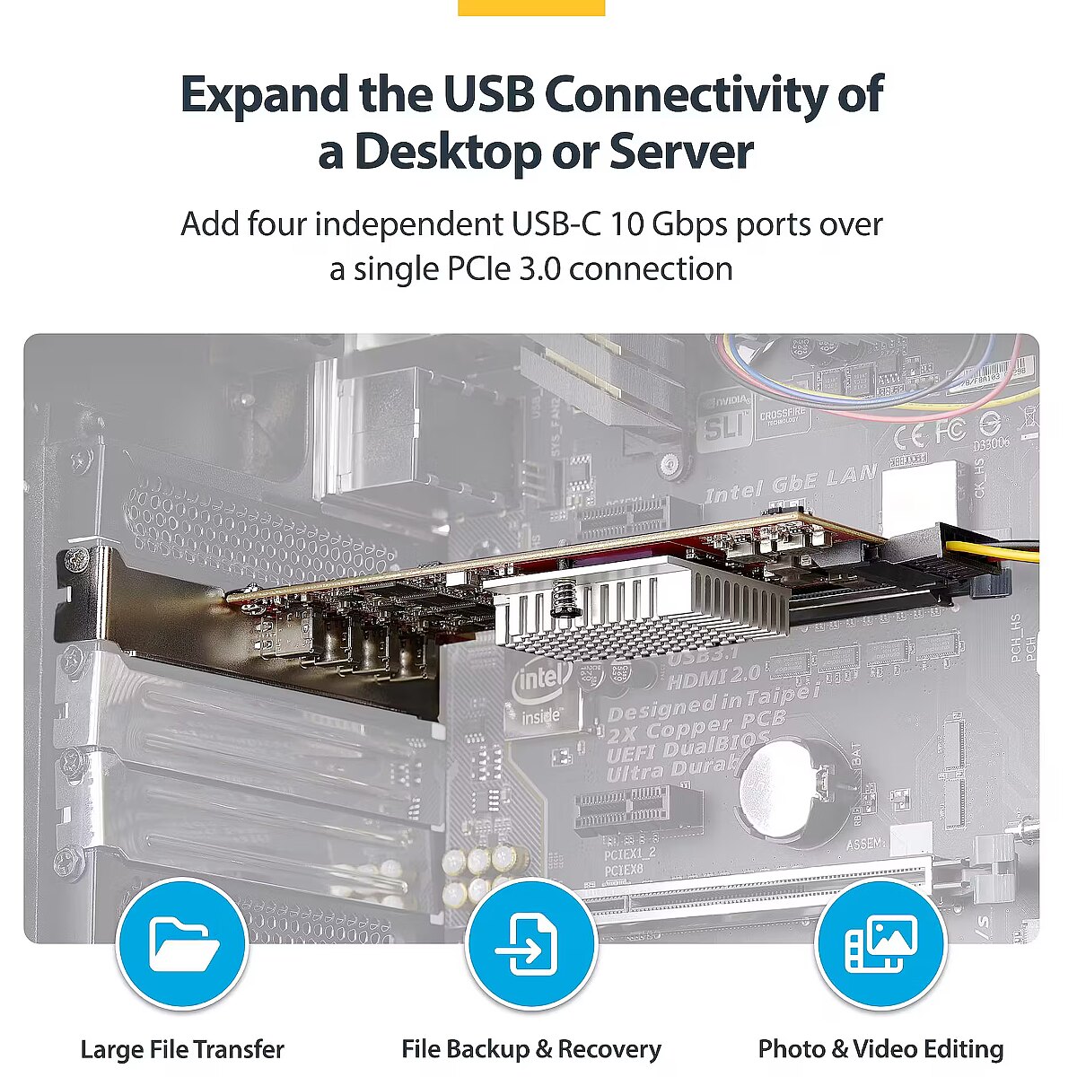 LongDesc - Add four 10Gbps USB Type-C ports to a server or desktop computer through PCI ExpressExpand the USB connectivity of a desktop computer or server by adding four external USB Type-C 10Gbps ports with this internal PCI Express 3.0 expansion card.Dedicated USB ControllersTraditional single-controller USB cards share bandwidth across all ports. With its four independent USB controllers, this USB-C expansion card enables each port to achieve up to 10Gbps, reducing bottlenecks and increasing data throughput.USB 3.2 Gen 2 (10Gbps) PerformanceThe high bandwidth makes the card ideal for transferring large files, real-time editing of high-resolution photos and videos on external storage, off-loading media from mobile devices, using high-resolution video capture devices, tethered photography equipment, or high-speed USB network adapters like 10G Ethernet copper or fiber adapter.Charge and Sync USB DevicesThis USB PCI Express card can provide up to 5V 3A (15W) per USB-C port, enabling sync and charge of portable devices. If the motherboard can't supply enough power, a built-in SATA power connector can supply additional power to the card.CompatibilityThe PCI Express USB card is plug-and-play in most major operating systems, including Windows, macOS, and Linux. The card is compatible with PCI Express 3.0 and x4, x8, and x16 slots. The USB expansion card also ships with a pre-installed standard profile bracket and includes a low-profile bracket for maximum compatibility.The StarTech.com Advantage