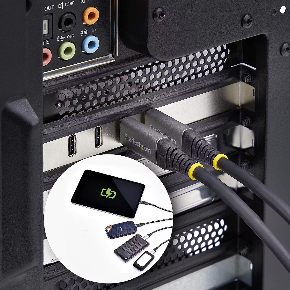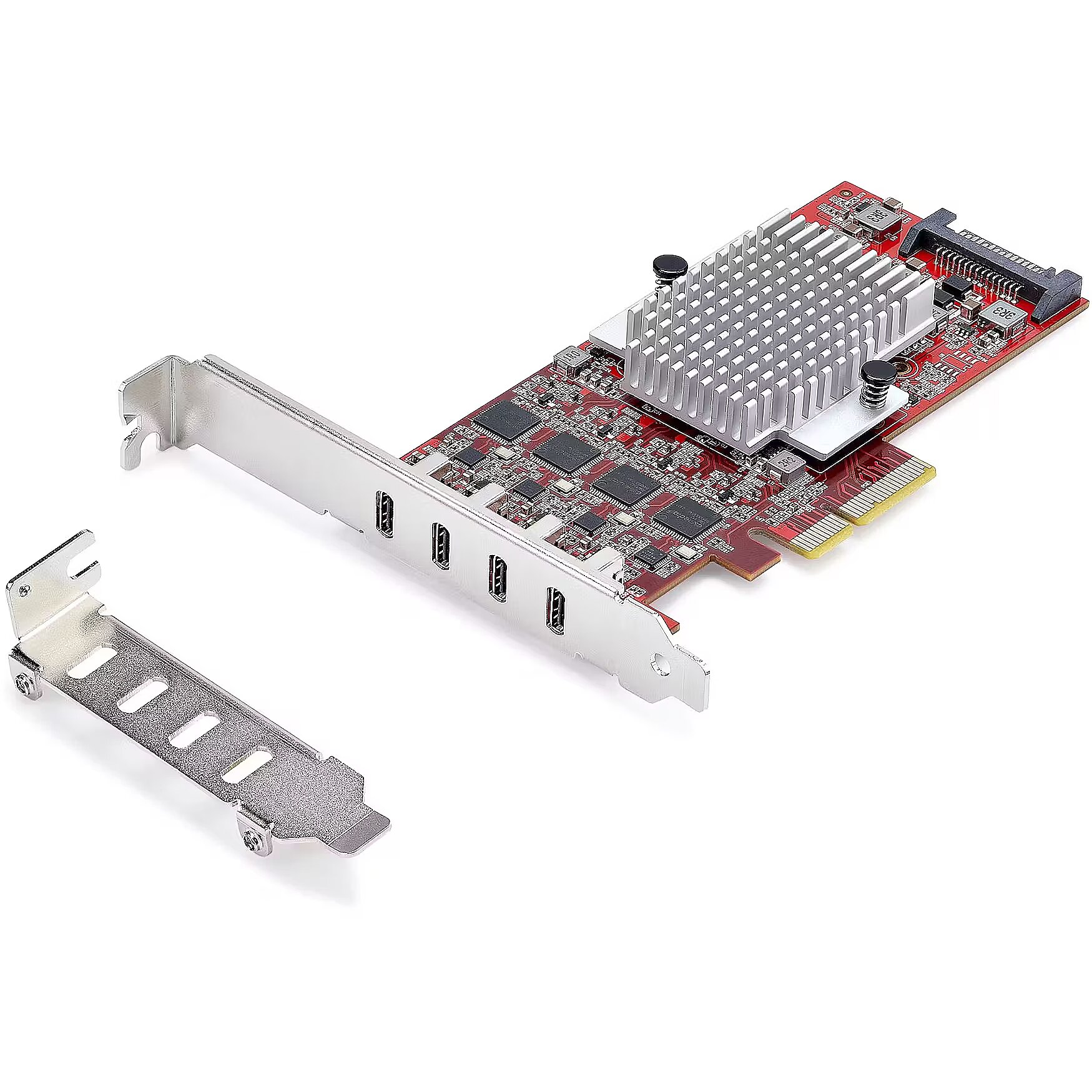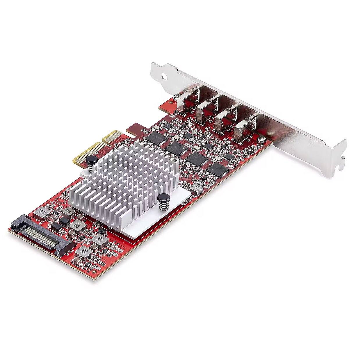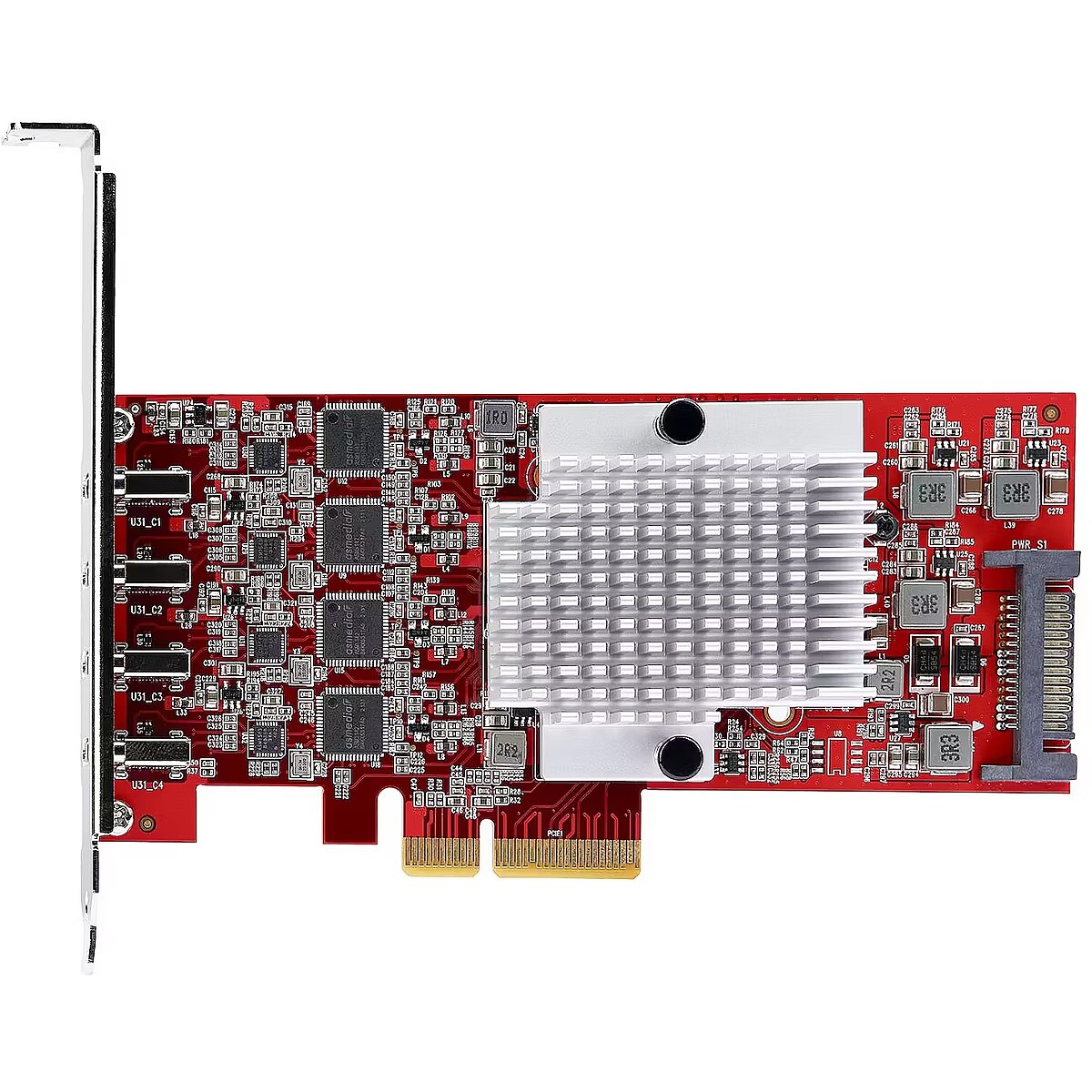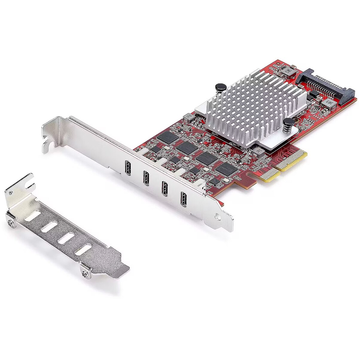 LongDesc - Add four 10Gbps USB Type-C ports to a server or desktop computer through PCI ExpressExpand the USB connectivity of a desktop computer or server by adding four external USB Type-C 10Gbps ports with this internal PCI Express 3.0 expansion card.Dedicated USB ControllersTraditional single-controller USB cards share bandwidth across all ports. With its four independent USB controllers, this USB-C expansion card enables each port to achieve up to 10Gbps, reducing bottlenecks and increasing data throughput.USB 3.2 Gen 2 (10Gbps) PerformanceThe high bandwidth makes the card ideal for transferring large files, real-time editing of high-resolution photos and videos on external storage, off-loading media from mobile devices, using high-resolution video capture devices, tethered photography equipment, or high-speed USB network adapters like 10G Ethernet copper or fiber adapter.Charge and Sync USB DevicesThis USB PCI Express card can provide up to 5V 3A (15W) per USB-C port, enabling sync and charge of portable devices. If the motherboard can't supply enough power, a built-in SATA power connector can supply additional power to the card.CompatibilityThe PCI Express USB card is plug-and-play in most major operating systems, including Windows, macOS, and Linux. The card is compatible with PCI Express 3.0 and x4, x8, and x16 slots. The USB expansion card also ships with a pre-installed standard profile bracket and includes a low-profile bracket for maximum compatibility.The StarTech.com Advantage