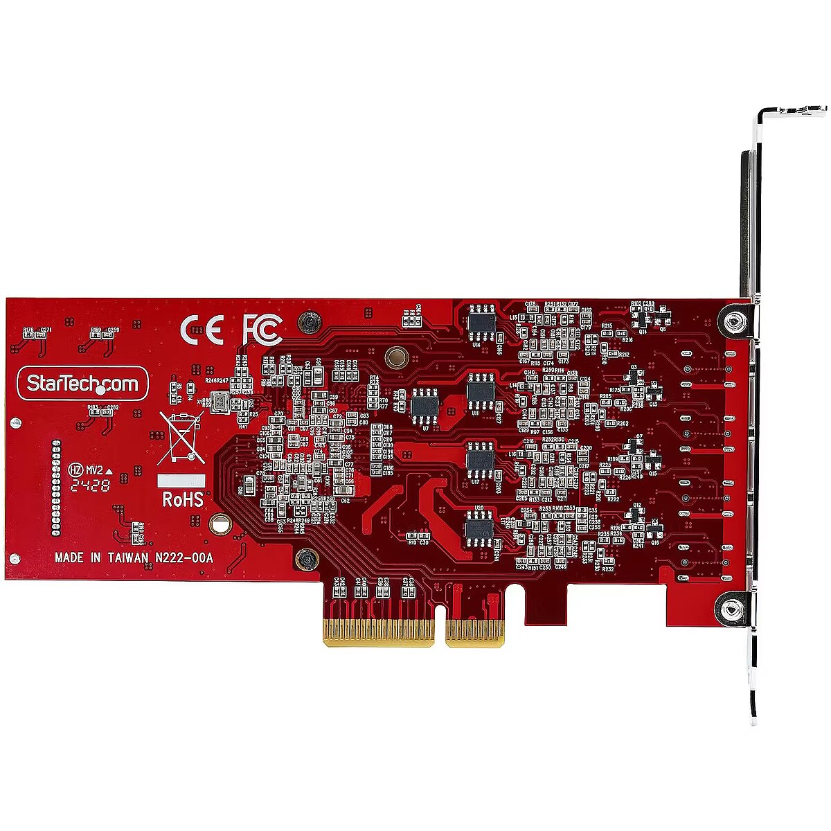 LongSummaryDescription - StarTech.com 4-Port USB Type-C PCIe Card, USB 3.2 10Gbps, USB-C PCI Express Expansion Card, 4x Independent USB Controllers, Windows/Linux/macOS, TAA-Compliant. Host interface: PCIe, Output interface: USB Type-C, Expansion card standard: PCI 3.0. Product colour: Red. Chipset: ASMedia - ASM3142 x4, ASMedia - ASM1543 x4, ASMedia - ASM2812X, Data transfer rate (max): 10 Gbit/s. Windows operating systems supported: Windows 10, Windows 10 Education, Windows 10 Education x64, Windows 10 Enterprise, Windows 10..., Server operating systems supported: Windows Server 2019, Windows Server 2022. Width: 56.2 mm, Depth: 140 mm, Height: 119.9 mm