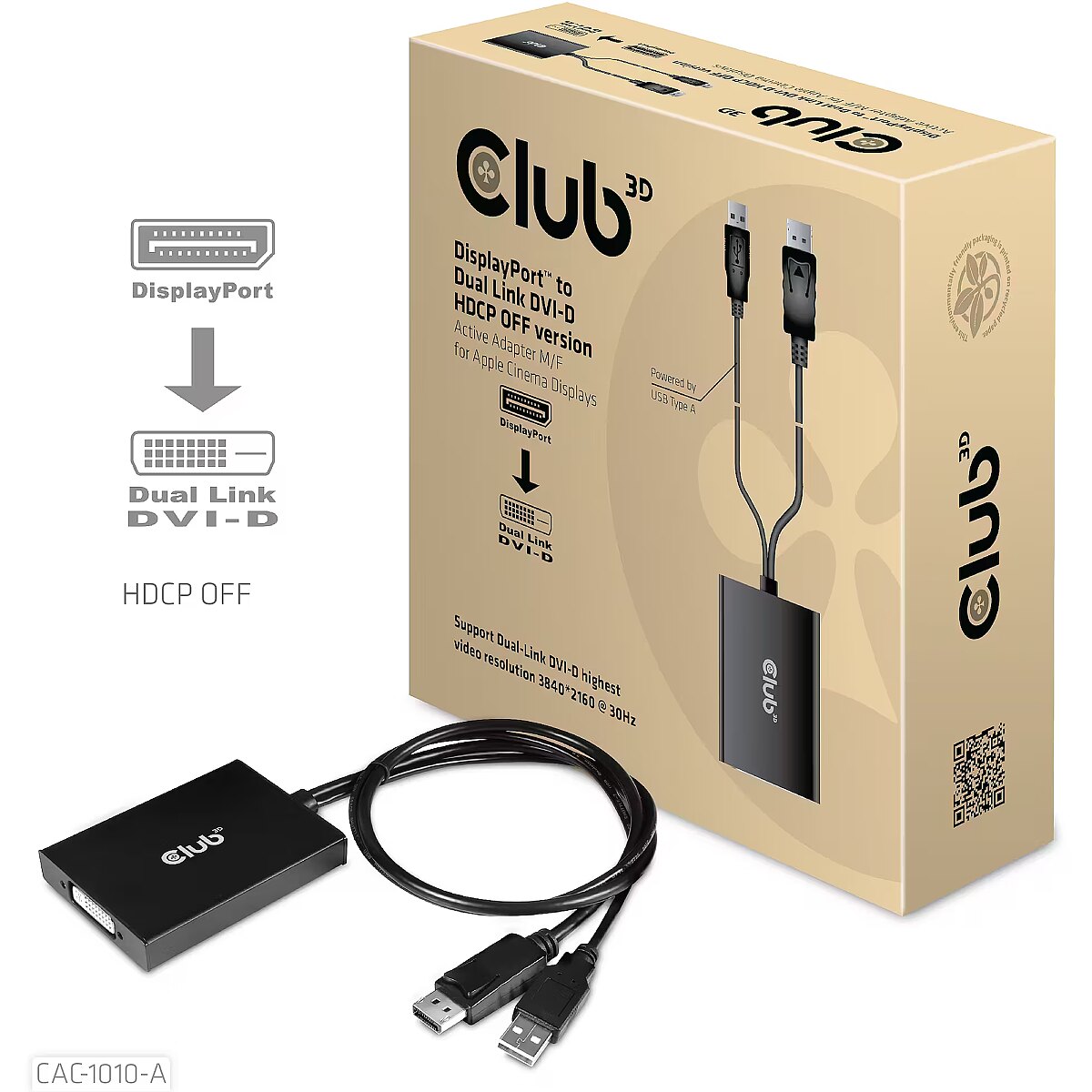 ShortSummaryDescription - CLUB3D DisplayPort to Dual Link DVI-D HDCP OFF version Active Adapter M/F for Apple Cinema Displays, 0.6 m, DisplayPort, DVI-D + USB, Male, Female, Straight