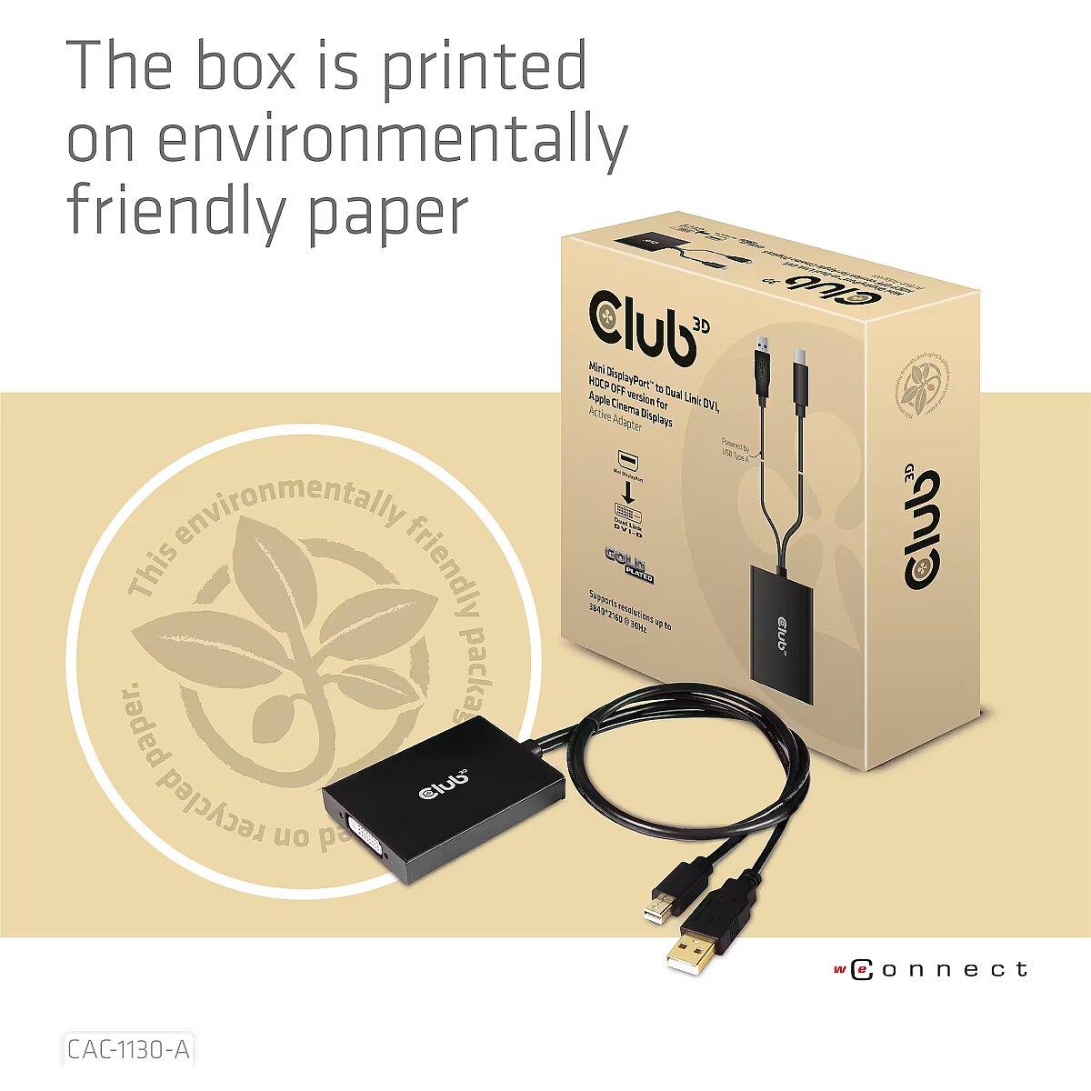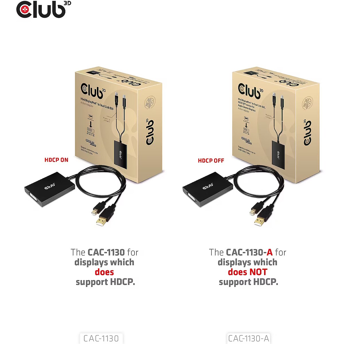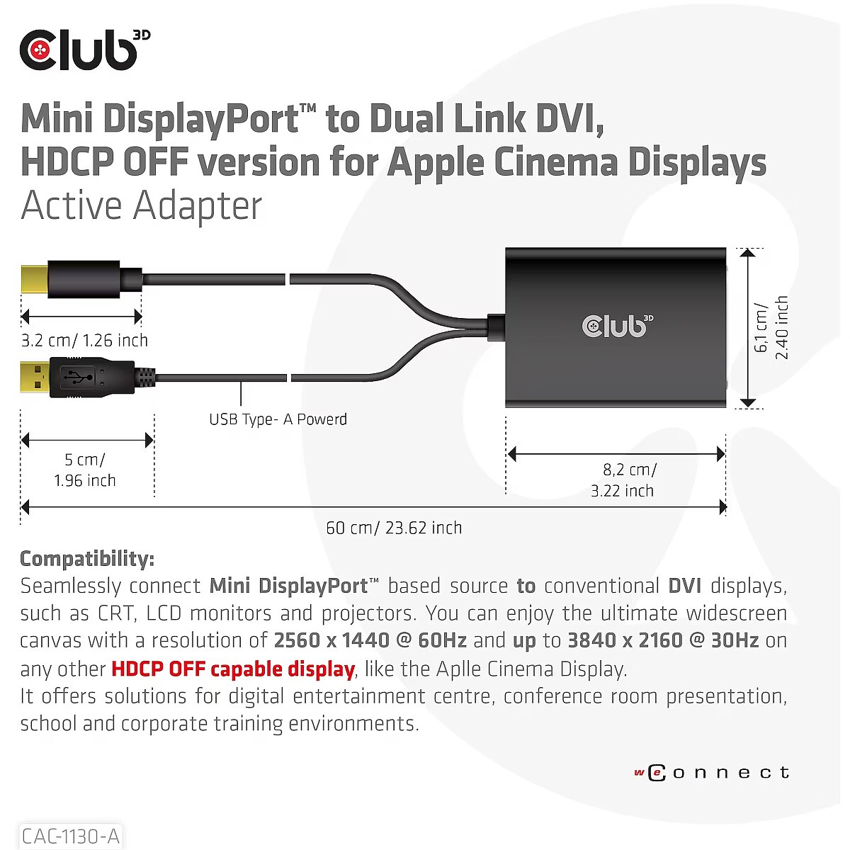 LongSummaryDescription - CLUB3D Mini DisplayPort to Dual Link DVI, HDCP OFF version for Apple Cinema Displays Active Adapter. Cable length: 0.6 m, Connector 1: DVI-D, Connector 2: Mini DisplayPort + USB Type-A. Certification: ROHS, FCC, CE EMI. Plastic packaging weight: 5 g, Paper/cardboard packaging weight: 64 g. Connector 1 dimensions (WxDxH): 61 x 83 x 14 mm, Weight: 109 g. Package width: 145 mm, Package depth: 45 mm, Package height: 145 mm