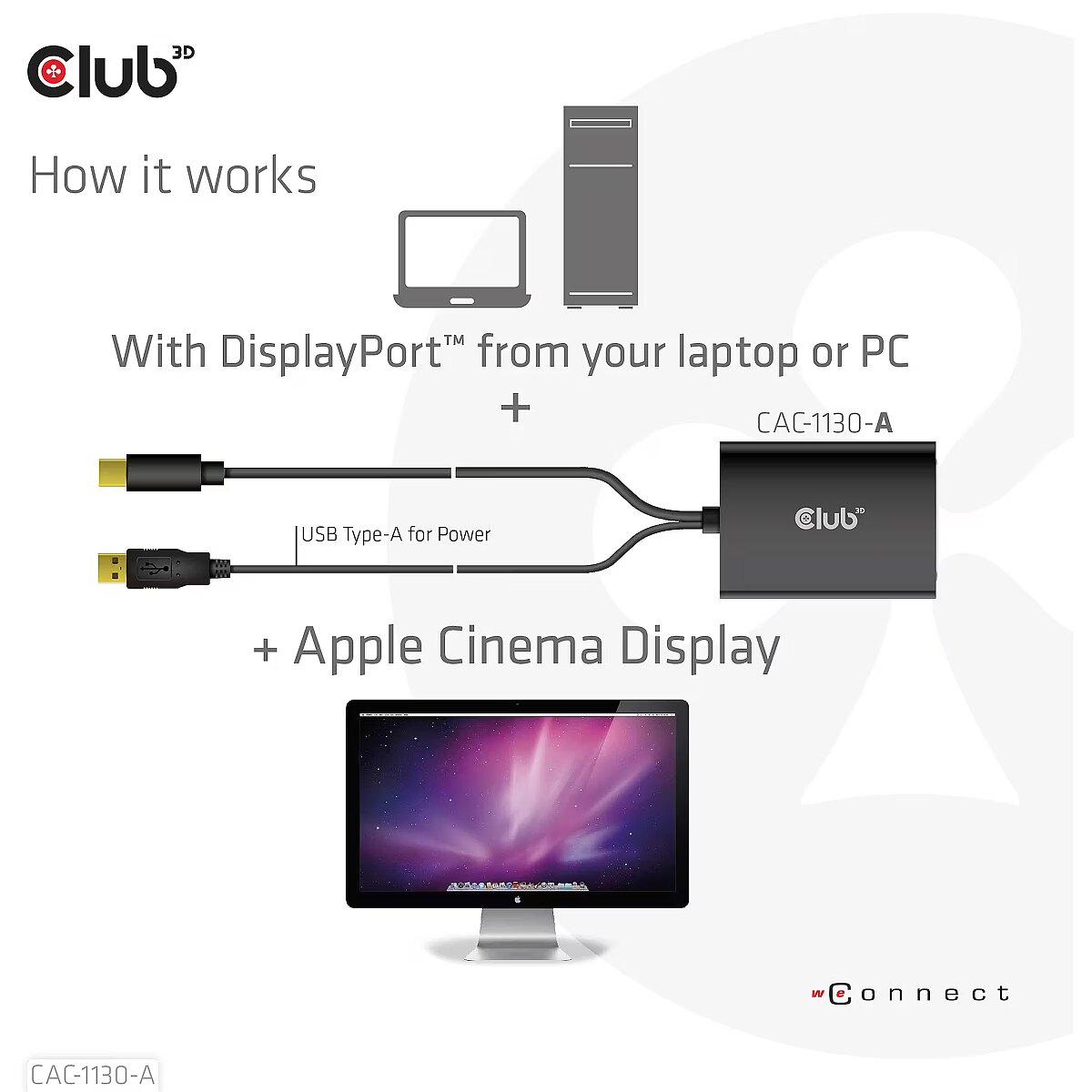 LongDesc - The CAC-1130-A Mini DisplayPort™ + USB Type-A (for Power) to Dual Link DVI signal format converter, HDCP OFF version for Apple Cinema Displays or other displays which do not support HDCP. Seamlessly connect Mini DisplayPort™ based source to conventional DVI displays, such as CRT, LCD monitors and projectors. You can enjoy the ultimate widescreen canvas with a resolution of 2560 x 1440 @ 60Hz and up to 3840 x 2160 @ 30Hz on any other HDCP OFF capable display, like the Apple Cinema Display.It offers solutions for digital entertainment centre, conference roompresentation, school and corporate training environments.