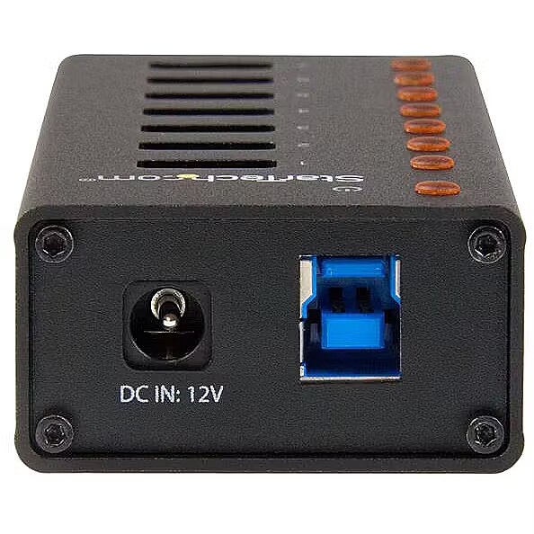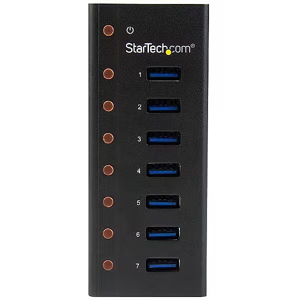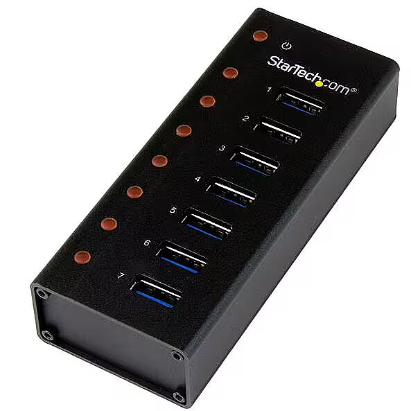 ShortSummaryDescription - StarTech.com 7-Port USB 3.0 Hub - Desktop or Wall-Mountable Metal Enclosure~7-Port USB 3.0 Hub (5Gbps) - Desktop or Wall-Mountable Metal Enclosure, USB 3.2 Gen 1 (3.1 Gen 1) Type-B, USB 3.2 Gen 1 (3.1 Gen 1) Type-A, 5000 Mbit/s, Black, Aluminium, Power