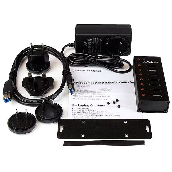 LongDesc - Connect 7 high-performance devices to your computer or Mac with this compact and rugged hubThe StarTech.com 7-port USB 3.2 Gen 1 hub is your answer for a durable and compact hub that's ideal for desktop or travel usage.Enjoy desktop convenience or painless portabilityThis hub is perfect for a permanent setup with a desktop computer, with a rugged metal housing that can withstand the wear and tear of daily use. Plus, you can attach it to a surface such as a desktop or wall using the included wall-mount bracket.The compact size and durability of the hub also make it perfectly portable. When you’re on the go, its robust design resists damage that can occur when travelling or from back-and-forth trips from home to office.Connect devices quickly and easilyThe ports on this hub are upright, which makes it perfect for IT professionals or anyone who needs to plug and unplug their USB devices regularly. You have lots of room to grip the connectors, without the worry of oversized plugs taking up too much space and reducing the number of available ports.With extra USB 3.2 Gen 1 ports, you can increase productivity and connect more devices to your computer, or simply avoid the hassle of swapping connected devices on your port-limited laptop. The hub makes your USB ports more accessible and can easily extend the range of your devices by acting as a mid-point repeater.Use with high-performance and older devicesThe ST7300U3M supports the latest USB 3.2 Gen 1 products including UASP-enabled storage devices. With data transfer speeds of up to 5 Gb per second using SuperSpeed USB 3.2 Gen 1 technology, this high-performance hub is the perfect accessory for your desktop, laptop, MacBook®, or UltraBook™.You can also use the hub with older peripherals and computers, with support for USB 2.0 and 1.x devices and no additional drivers or software required for installation.Backed by a StarTech.com 2-year warranty and free lifetime technical support.The StarTech.com Advantage