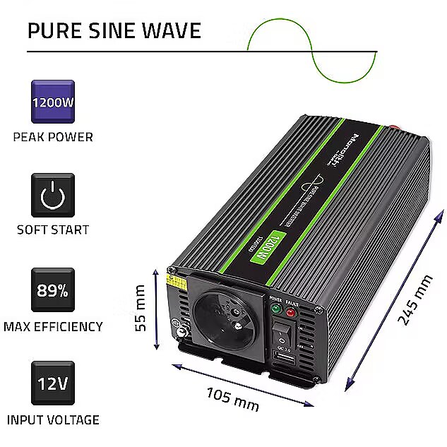Qoltec Pure Sine Wave Inverter Monolith, 600W, 1200W