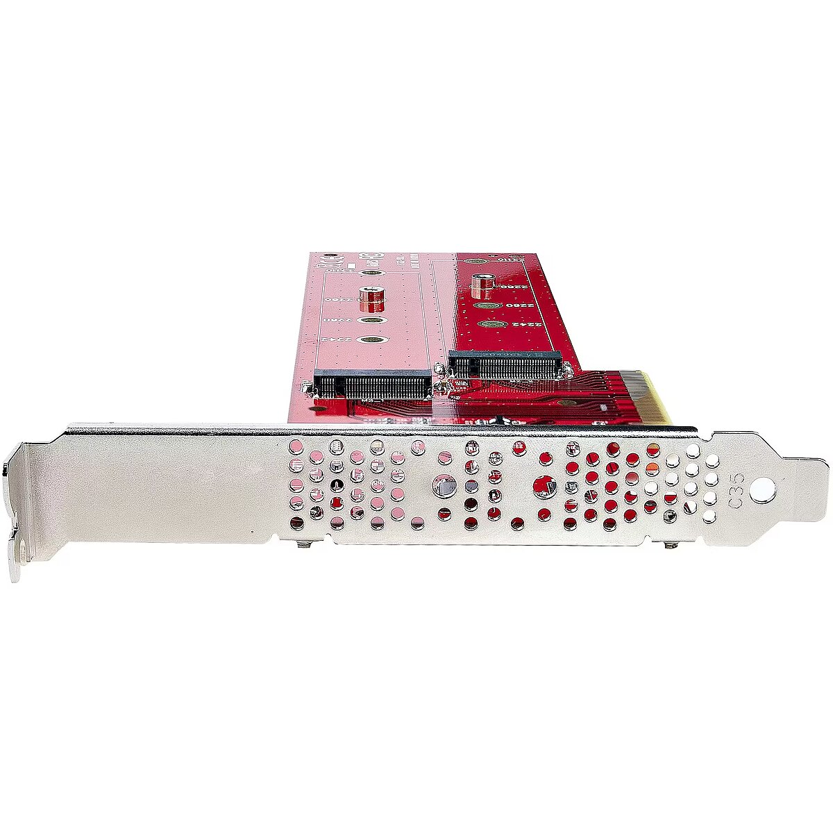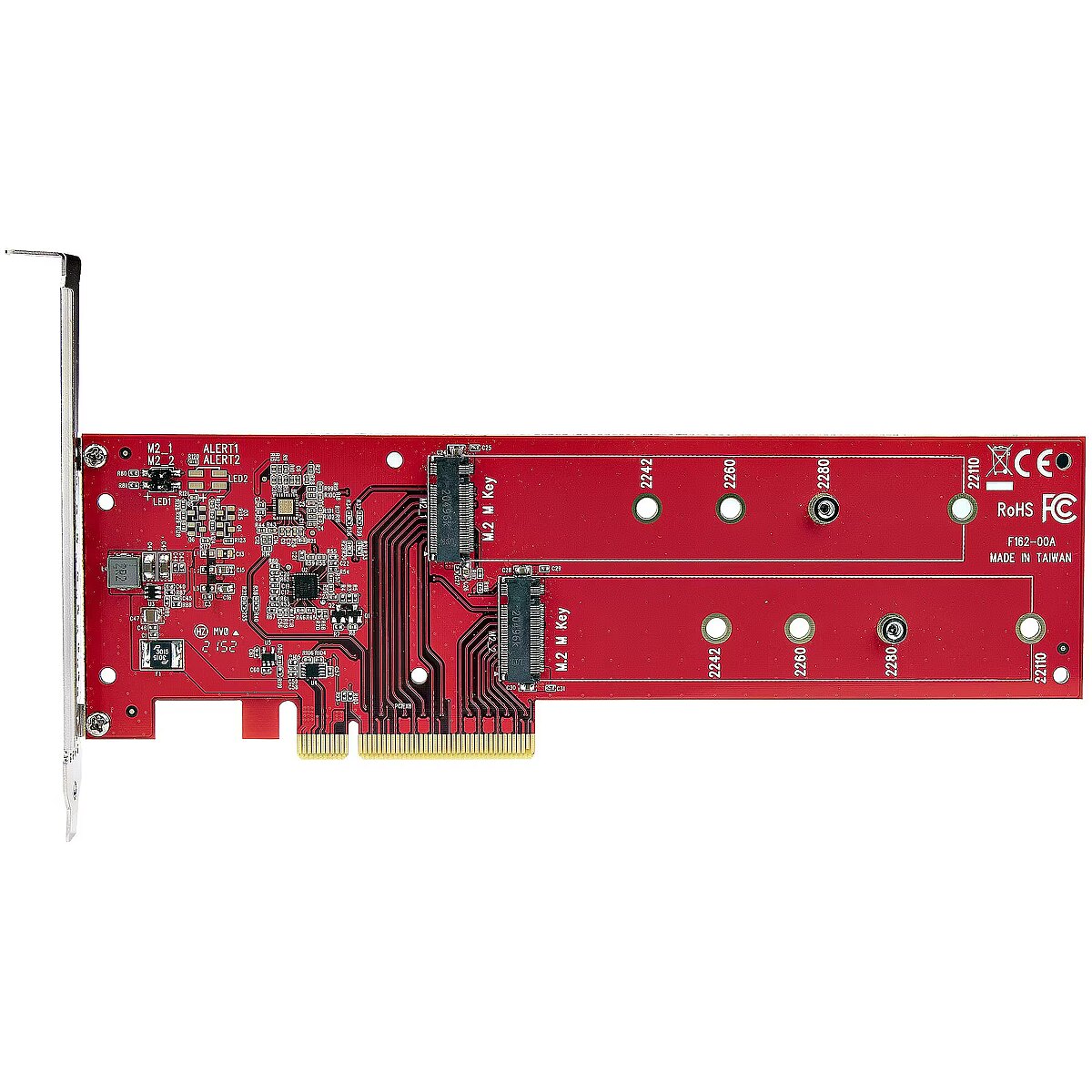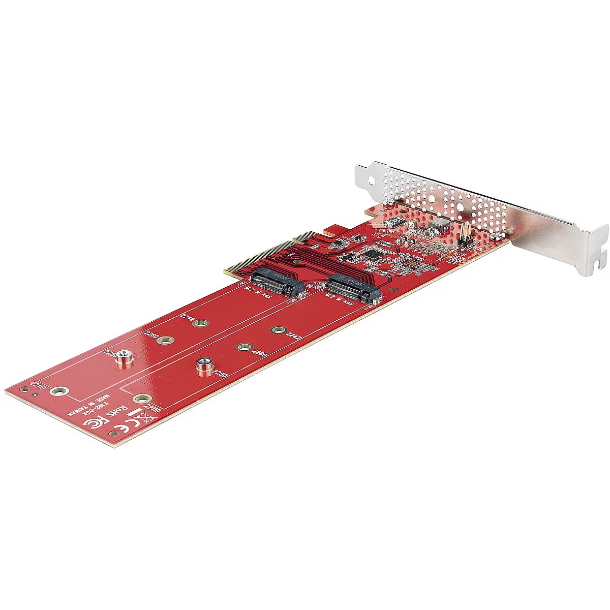 LongSummaryDescription - StarTech.com Dual M.2 PCIe SSD Adapter Card, PCIe x8 / x16 to Dual NVMe or AHCI M.2 SSDs, PCI Express 4.0, 7.8GBps/Drive, Bifurcation Required - Windows/Linux Compatible. Host interface: PCIe, Output interface: M.2, Expansion card standard: PCIe 4.0. Product colour: Red, Mean time between failures (MTBF): 6493014 h. Data transfer rate (max): 7.8 Gbit/s. Supported storage drive heights: 22 mm. Width: 102 mm, Depth: 228 mm, Height: 22 mm