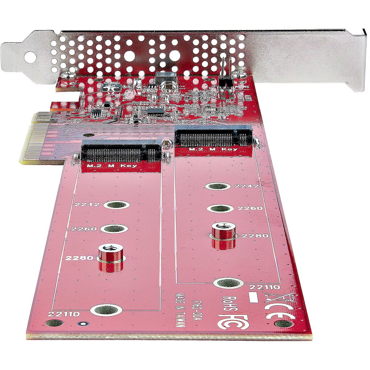 LongDesc - Dual M.2 NVMe / AHCI | PCIe 4.0 x8 or x16 Slot | BifurcationThis Dual M.2 PCIe SSD Adapter adds two high performance PCIe M.2 SSDs (NVMe and AHCI) into the PCIe x8 or x16 slot of a desktop, workstation, or server.Boost System PerformanceTake full advantage of the fast performance and compact size of PCIe M.2 internal solid-state drives, with read and write speeds up to 7.8GBps per drive.Access two M.2 PCIe SSDs simultaneouslyNo on-board chip leads to wide system compatibility. This card requires PCIe bifurcation, meaning it easily integrates into any system with an available x8 or x16 PCIe slot that supports PCIe bifurcation.Utilize software RAID, such as Storage Spaces (Microsoft) or mdraid/mdadm (Linux), to build a RAID array, adding redundancy or enhancing system performance.Wide CompatibilityThe PCIe M.2 NGFF (M Key or B+M Key) adapter supports PCIe NVMe and PCIe AHCI M.2 SSDs including 2242, 2260, 2280 and 22110mm drives. The PCIe M.2 Adapter Card does not require any software or drivers, meaning it works with most operating systems, if the computer/motherboard supports bifurcation.Vented BracketsThe included full and low-profile vented brackets increase air flow to improve heat dissipation, which aids in maintaining optimal and reliable operating temperatures.The DUAL-M2-PCIE-CARD-B is backed for 2-years by StarTech.com, including free 24/5 multi-lingual technical assistanceThe StarTech.com Advantage