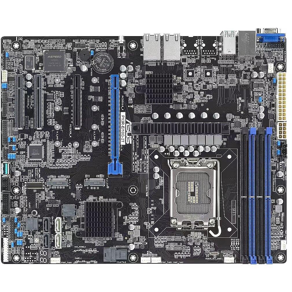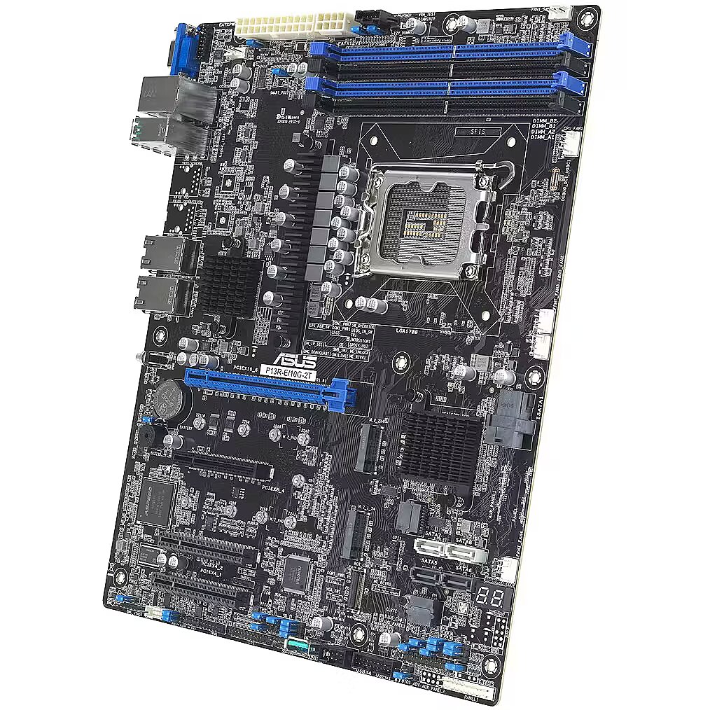 LongDesc - ASUS P13R-E/10G-2T is an Intel® Xeon® E-2400 and Intel® Xeon® 6300 LGA 1700 ATX server motherboard with four DDR5 ECC UDIMM slots, two M.2 slots, dual 10 Gb LAN ports, eight SATA ports, two PCIe® 5.0 slots and two PCIe® 4.0 slots, four USB 10Gbps ports, two USB 2.0 ports and an onboard ASUS ASMB11-iKVM management module.PCIe 5.0 ReadyFaster storage, graphics and networking capabilities PCI Express® (PCIe®) 5.0 delivers 32GT/s bandwidth. The ASUS P13R-E/10G-2T supports both PCIe® 4.0 and 5.0 for better LAN scalability and backwards compatibility to satisfy the increasing workloads for modern data center.Intel Xeon E-2400 processors/Intel Xeon 6300 processorsDesigned for small- to medium-sized businesses (SMBs) and cloud-service providers, offering robust and secure solutions. These processors support up to eight cores and 16 threads, with a maximum frequency of 5.6 GHz and a 95 W TDP, ensuring rapid data processing and application responsiveness. They support up to 128 GB of DDR5 4400 MT/s memory (Intel Xeon E-2400) or up to 4800 MT/s memory (Intel Xeon 6300) and PCIe 5.0 interfaces, providing server-grade 24/7 reliability for business-critical services and customer data, and cost-effective performance for entry-level bare-metal cloud services.Four fast USB 3.2 Gen 2 portsASUS P13R-E/10G-2T is equipped with four USB 3.2 Gen 2 ports on its rear I/O panel. These high-speed connections offer rapid data-transfer speeds of up to 10 Gbps, for fast, efficient and reliable file transfers. These sockets are also backward compatible, ensuring seamless connectivity with a wide range of USB devices.Dual Ethernet bandwidthWith dual onboard LAN powered by an Intel X710-AT2 Ethernet controller, P13R-E/10G-2T server motherboards provide business-grade connectivity and support high-density, high-bandwidth, low-latency access-layer networks to ensure faster transfers of large-size files used in data-intensive applications.Versatile Memory and SSD IntegrationThe P13-E/10G-2T boasts eight SATA ports and four DDR5 ECC UDIMM Memory slots, delivering up to 128 Gbps performance and incorporates two M.2 22110 slots for faster OS booting. This integration services as accelerators for virtualized workloads, boosting the server productivity.Comprehensive IT infrastructure managementP13R-E/10G-2T features an embedded iKVM module and is optionally equipped with ASUS Control Center, offering comprehensive out-of-band and in-band management features tailored for small and mid-size businesses. The embedded ASUS ASMB11-iKVM module supports remote BIOS updates, fan control, standalone KVMs, video recording and BSOD capture, providing around-the-clock remote monitoring and diagnostics. This functionality remains accessible even if the operating system is down or offline, through a user-friendly web-based graphical interface compatible with all major browsers. ASUS Control Center (ACC) further enhances IT infrastructure management, centralizing and integrating monitoring and control for ASUS commercial products, including servers, workstations, and digital signage. ACC enables remote BIOS updates, mobile device system monitoring, and simplified server management through one-click software updates and dispatching.