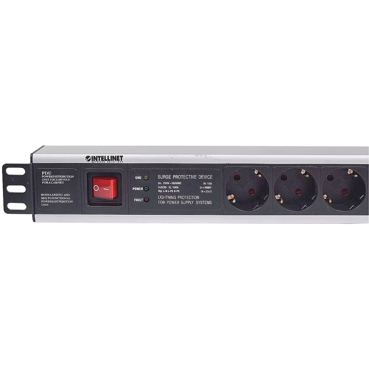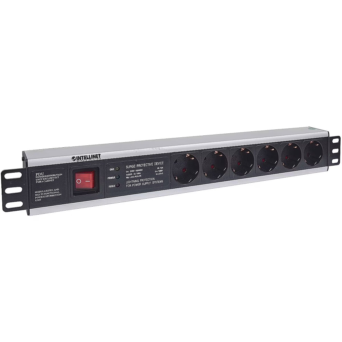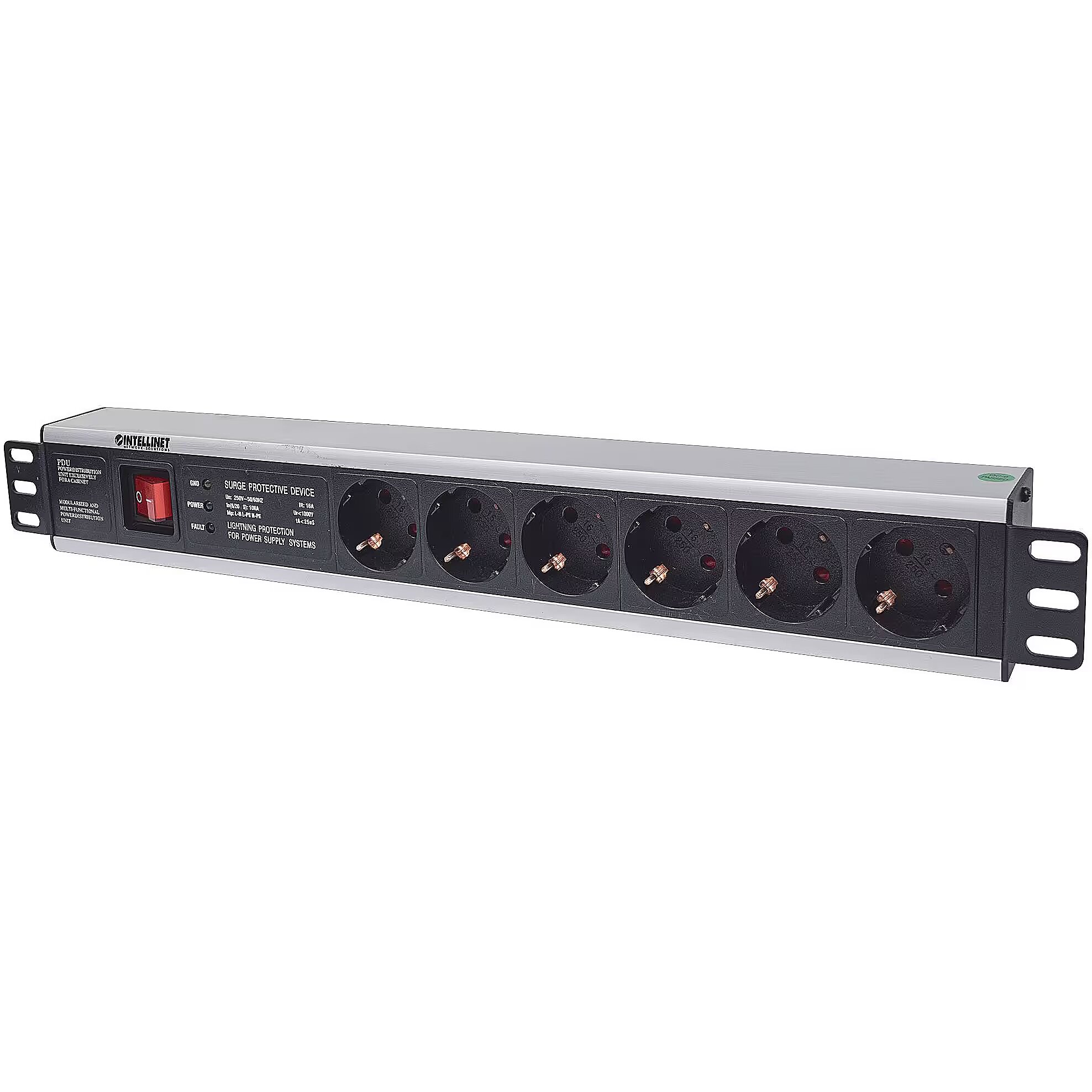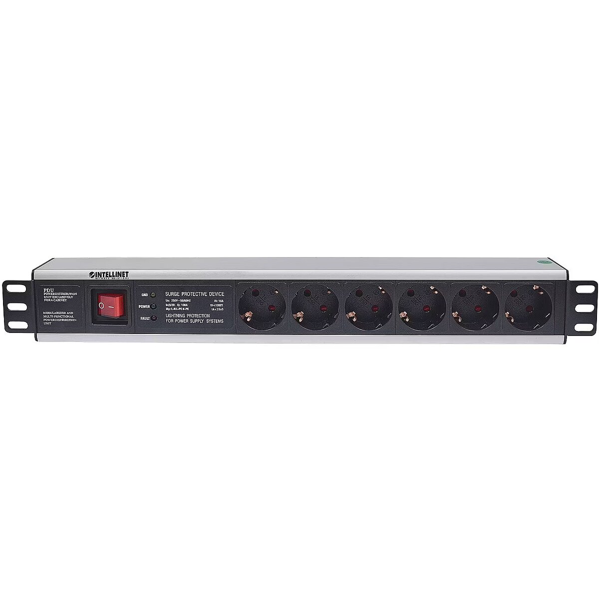 ShortSummaryDescription - Intellinet 19" 1.5U Rackmount 6-Output Power Distribution Unit (PDU) EU CEE 7/3 Outlets, With On/Off Switch and Surge Protection, Built-in 3 m (10 ft.) Power Cord with EU CEE 7/4 Plug, 1.5U, Power bar, Aluminium, Black, 6 AC outlet(s), 3 m