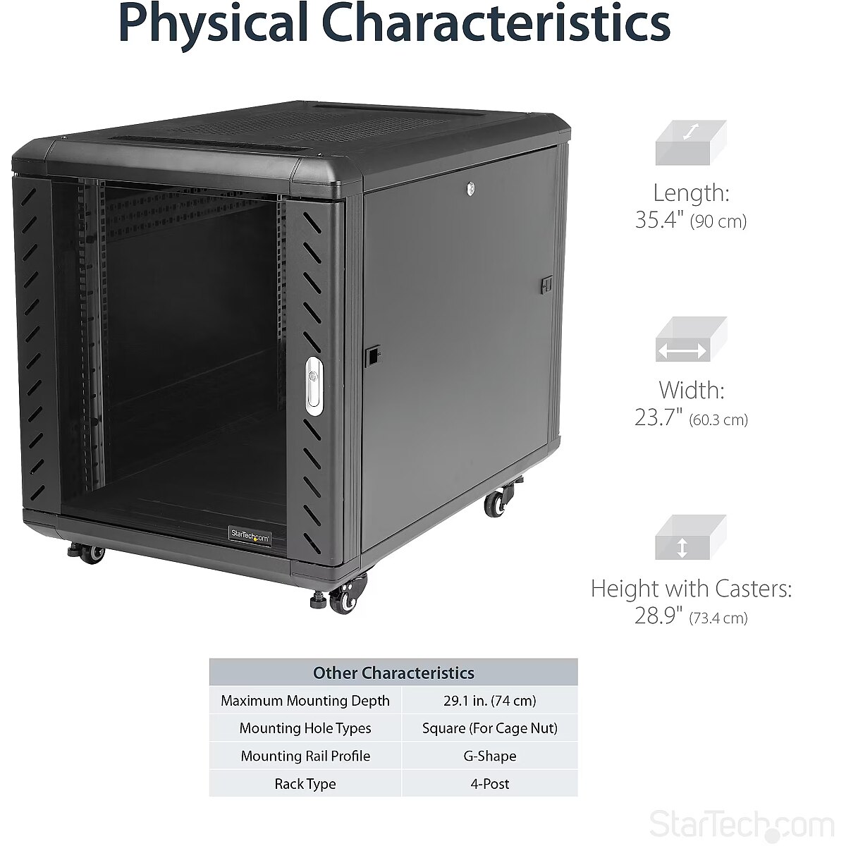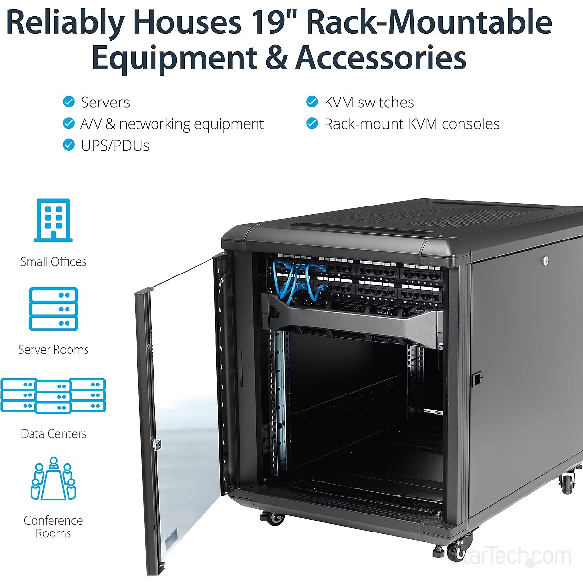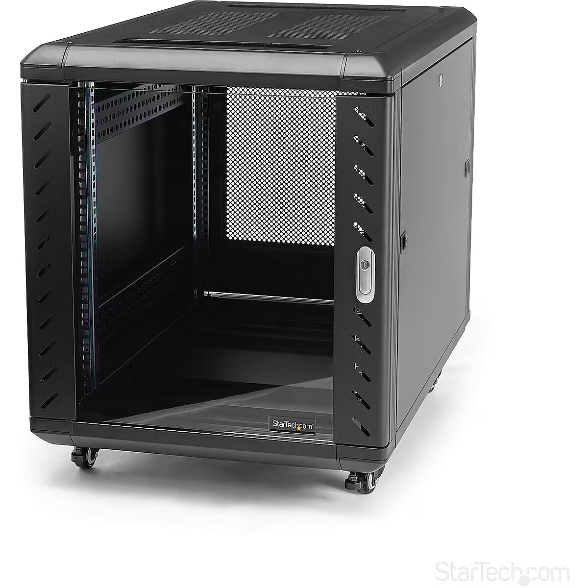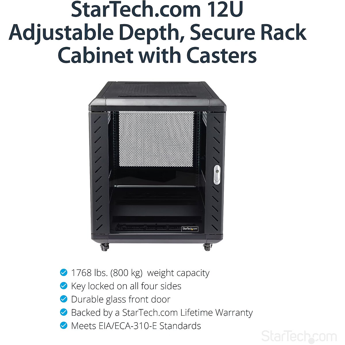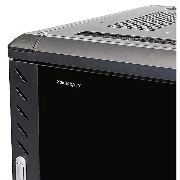 LongDesc - Securely store servers, network and telecommunications equipment in this 12U server rackThis server rack provides 12U of storage space in a sleek secure cabinet for storing EIA-310 compliant 19" rackmount devices such as Dell, HP and IBM servers along with telecommunication and A/V equipment. The rack creates a robust storage solution supporting a total load capacity of 800 kg. (1763.7 lbs).Hassle-free equipment installationThis rack has been engineered with different features that enable you to easily incorporate plenty of equipment.With adjustable mounting rails you can easily change the rail depth to up to 29 in. (740mm). These rails ensure the cabinet is widely compatible with your standard rackmountable equipment. The added depth also provides support for additional cable and power management behind your equipment.The rack features brushed ports on the ceiling and floor panels that enable you to easily run cabling to the inside and outside of the cabinet, for discreet cable management. The floor and ceiling panels can also be removed enabling you to customize your setup, and the rack features grounding lugs that enable you to ground your equipment for added protection.Securely protect your equipment while still being able to see itTo ensure you have full visibility of your equipment while securely locking it up, this rack has a stylish glass window on the front door. The glass door looks great in any server room, and gives you the freedom to clearly monitor equipment without the hassle of opening your rack.The rack also has removable side panels with independent locks quick-release mechanisms that enable you to easily access your equipment while still keeping it secure.Save money, with a cost effective, compact shipping containerThe cabinet comes in a flat packed box to reduce shipping volume, which significantly reduces your costs in shipping. Plus, because the rack is packaged efficiently, you can easily store the cabinet, for deployment at a later date.Maximum Maneuverability, with casters includedThe cabinet features casters ensuring hassle-free access to the rear mounted equipment, while providing ease of mobility around your office, studio or server room. Plus, the width and height of the rack fits through standard doorways, giving you the freedom to wheel your server rack into different rooms.Ensure your equipment is running at an optimal temperatureThe rear door on the rack is mesh, and the front glass door is vented, working together to increase airflow to provide passive cooling that's cost effective and ensures your equipment runs at an optimal temperature.The top ceiling panel features square venting holes that are cage nut compatible, which provide mounting points that enable you to add additional equipment at the top of your rack.The RK1236BKF is backed by a lifetime StarTech.com warranty with free technical support.The StarTech.com Advantage