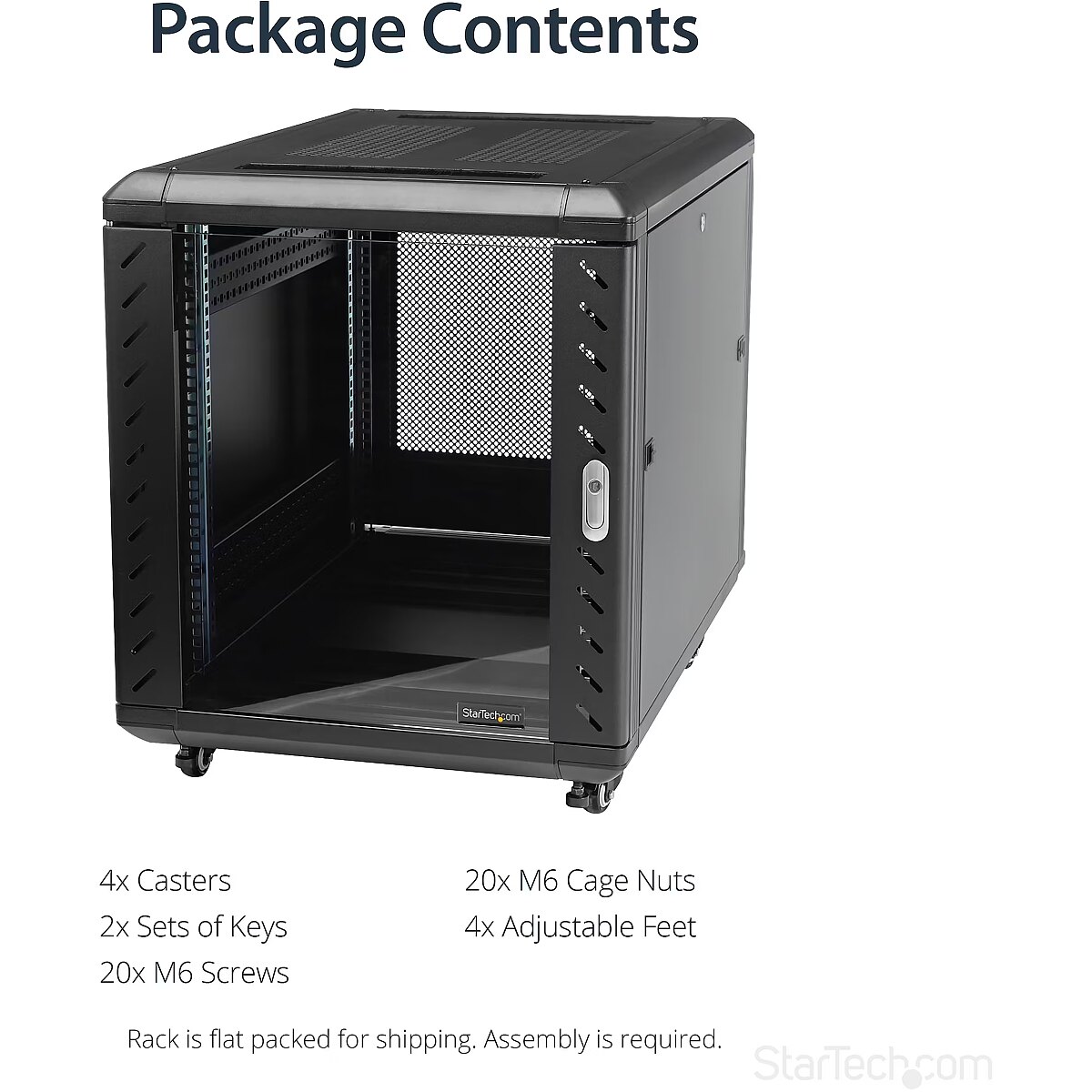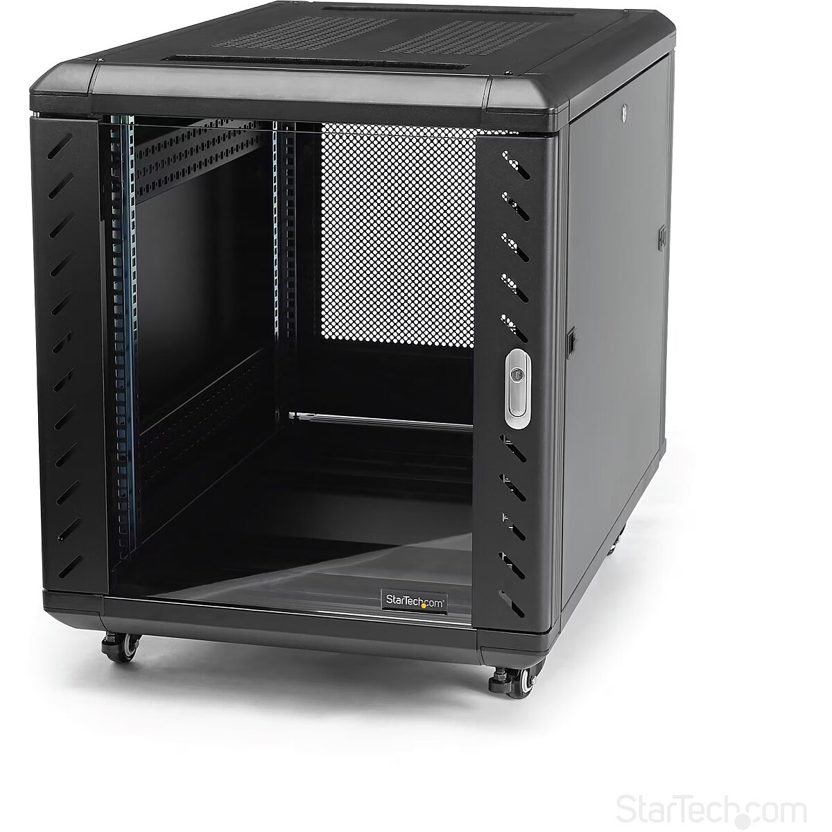 ShortSummaryDescription - StarTech.com 4-Post 12U Server Rack Cabinet, Lockable 19" Data Rack Cabinet for Computer / AV / IT Equipment, Office / Home Network Rack with Casters & Adjustable Mounting Rails, Freestanding rack, 12U, 800 kg, Key lock, Castor wheels, 43.5 kg