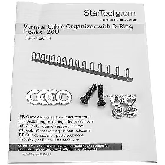 LongDesc - Organize your cables in any rack or cabinet that’s 20U or larger, using this vertical cable management panelThis 3-foot vertical cable manager gives you a simple and space-efficient way to organize the cables in your server rack. You can attach the cable manager vertically into your rack, to neatly guide cables between equipment that’s mounted at different heights.The 0U cable manager offers versatile installation options and is compatible with most racks that are 20U or larger. The panel features a 0U design that doesn’t take up any mounting space, and with simple tool-less installation it's easy to attach or reposition as necessary.Improve the appearance and accessibility of your rackThe cable manager uses a D-ring method of cable management to run cables vertically along the side of your rack, neatly guiding them between equipment that’s mounted at different heights. This provides a tidy and well-organized way to run cables from devices mounted toward the bottom of your rack to other devices mounted near the top, without leaving a mess of cables hanging in between.Having neatly organized and routed cables not only improves the appearance and accessibility of your rack, it also makes it easier for you to install, access and maintain rack components.Hassle-free compatibility with your rackFor maximum compatibility with virtually any server rack, you can install the cable-management panels using mounting holes that are commonly found on most rack equipment. The tool-less mounting method attaches the cable management panel to the keyhole-shaped mounting holes that are built into your rack.The horizontal mounting rail method attaches the cable management panel to the horizontal mounting rails that run along the side of your rack.For racks that don't support these installation methods, you can also mount the cable management panels through other means, such as using the non-standardized holes found on your rack walls and enclosures, or the rack units on equipment mounting rails.Protect your equipmentRouting your cables through a panel reduces the tension that's often put on cables. This prevents cable damage or connection loss, and reduces strain on equipment ports, preventing damage to your expensive rack-mount devices.Properly routing cables also improves airflow, which passively cools devices stored in your rack, helping to keep your equipment running at optimal temperatures to reduce the probability of damage caused by your rack overheating.The CMVER20UD is backed by a StarTech.com 2-year warranty and free lifetime technical support.The StarTech.com Advantage