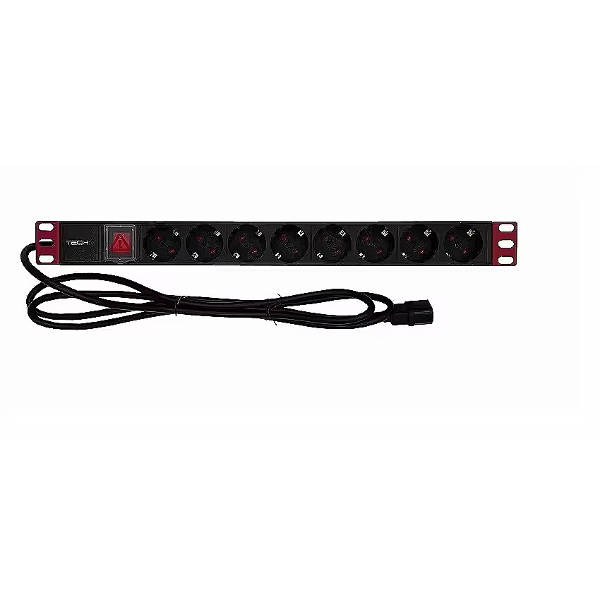 LongSummaryDescription - Techly Multi-Socket 8 Sockets for Rack 19" C14 Plug 1 HE. Rack capacity: 1U, Product colour: Black, Red. AC outlets quantity: 8 AC outlet(s), AC outlet types: Type F, Type L, Power plug: C14 coupler. Cable length: 2 m, Cable type: H05VV-F 3G 1.5 mm². Nominal input voltage: 220 - 250 V, Maximum current: 16 A, Maximum power: 2300 W. Compliance certificates: CE, RoHS, REACH, Certification: CE, RoHS, Reach