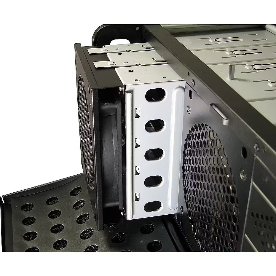 Technical_details - Type: Server Case Color: Black EAN: 4260133122611 Manufacturer number: 88887007 Design: Rack Mainboard form factor: E-ATX Material: 1.0-1.2mm steel Internal dimensions: ATX : 4 U Drive bays: 3 pieces : 10 pieces Slots: 7 pieces Front connectors: 1x USB-A 2.0, 1x USB-A 3.2 Gen 1 (5 Gbit/s) : The designation USB 3.2 Gen 1 corresponds to the former designation USB 3.1 Gen 1 / USB 3.0. Front: 2x 120 mm fans available, power switch, reset button, LED: power, hard drive activity, 2x network activity Rear: 2x 80mm fans available Notes: 3x 120 mm fans inside the case, lockable front flap with dust filter insert, drive cages can be removed and positioned as desired, 3.5" drives can be mounted without screws Accessories: keys, assortment of screws, mounting frame for mini-redundant power supplies, wrench for installing the spacers, mounting rails for 5.25" and 3.5" drives Dimensions: Width: 482mm x Height: 178mm x Depth: 695mm Weight: 13.2kg