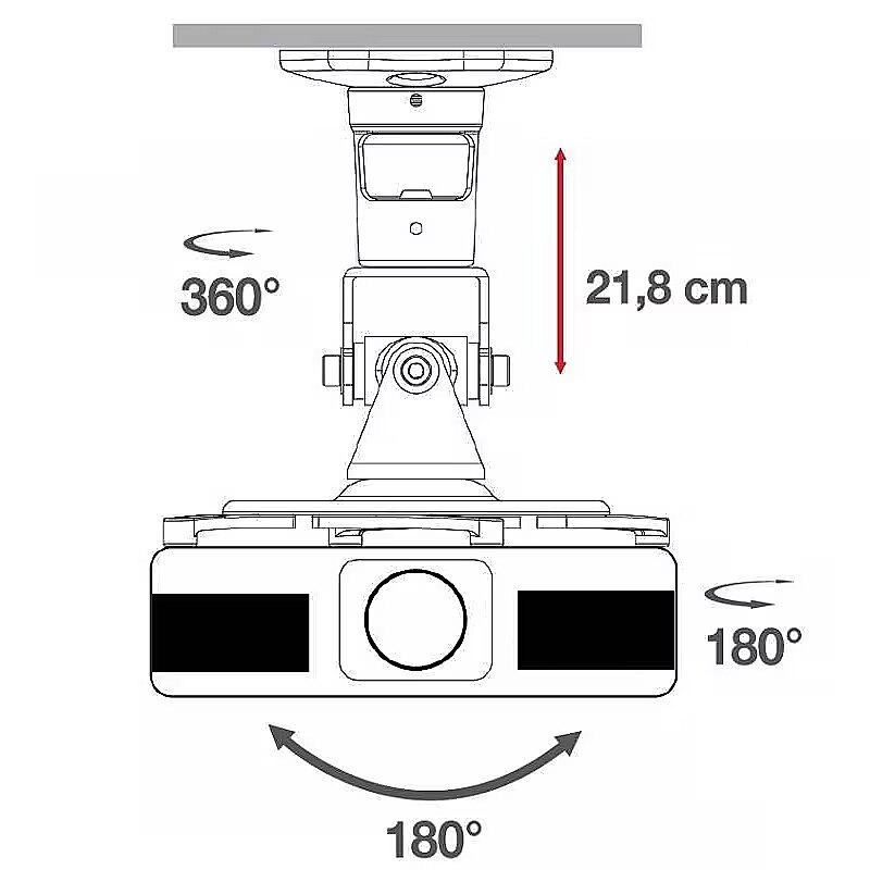LongDesc - ICA PM-100 BK is a universal ceiling support for projectors up to 10 kg. It provides a multidirectional positioning with four support arms adjustable that can adapt to a wide range of mounting holes. The cables required for the installation pass in the middle column and therefore are not visible. This media projector is perfect for use in classrooms, meeting rooms, hotels, bars and restaurants and much more.Characteristics- Universal bracket ceiling projector;- Compatible with most projectors on the market;- Maximum weight supported: 10 kg.Technical specifications- Ceiling mount for projectors;- With 4 support arms adjustable;- Material: Aluminum;- horizontal inclination: 180°;- Vertical Tilt: 180°;- Rotation: 360°;- With cable management system;- Finish: powder coating;- White color.Dimensions- Base width: 130 mm;- Depth base: 130 mm;- Height: 218 mm;- Width mounting bracket: 307 mm.Package Contents- Ceiling mount for projectors;- Mounting screws;- User manual.