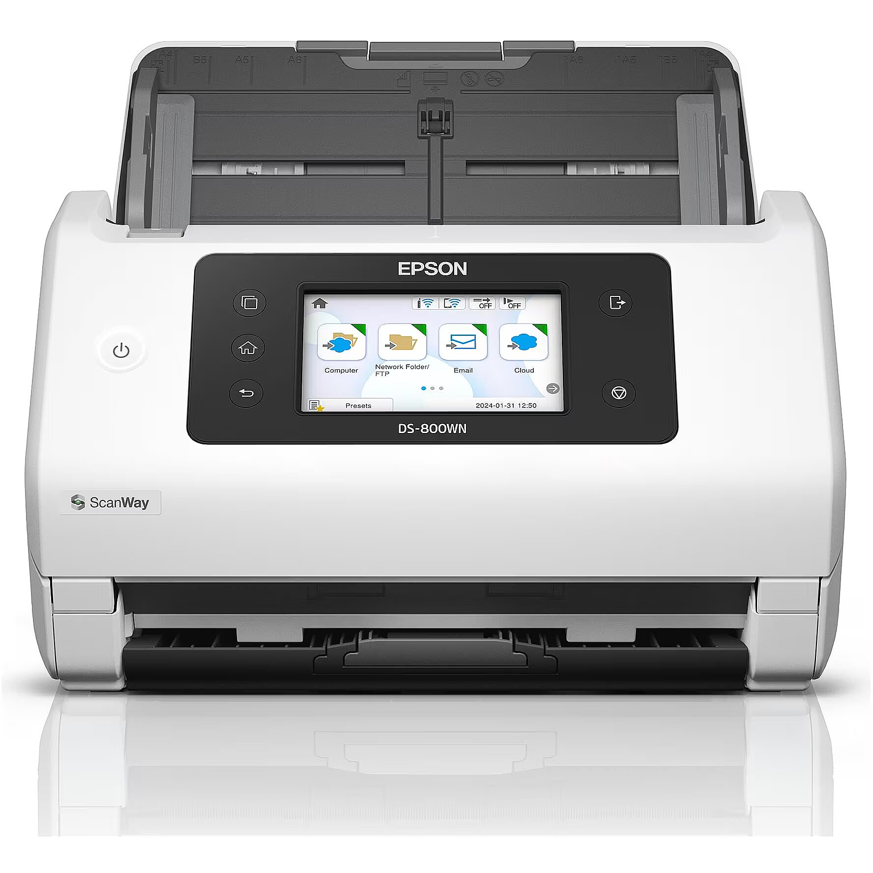 LongDesc - Open platformThe DS-800WN features web-based open platform which allows seamless integration with Epson software or third-party software solutions. This means that businesses can customise their systems and integrate the scanner with existing infrastructures, business processes and workflows.Network connectivityIntegrated network connectivity means that the scanner can be shared by multiple users and each user is able to create their own settings. Also, the LCD touchscreen allows the user to operate the scanner directly, without the use of a PC.High speedThe DS-800WN processes and digitises a high volume of documents, quickly and securely. Scan speed of 50ppm/100ipm, a daily duty cycle of 8,000 pages and an optional paper alignment plate, make this an ideal scanner for a wide range of industry sectors: from government, healthcare and legal, to finance, accounting and education.EfficientBuilt with efficiency in mind, the DS-800WN offers low power consumption, whether idle or in use. It's also made from 30% recycled plastics (from discarded IT products).- Open platform Full Integration with ISV or Epson software solutions- High speed 50ppm/100ipm, 8,000 pages daily duty cycle- Network connectivity USB 3.2 Gen1, Wi-Fi, Wi-Fi Direct, LAN- User-friendly Customisable LCD touchscreen, scan directly - no PC required- Efficient Low power consumption