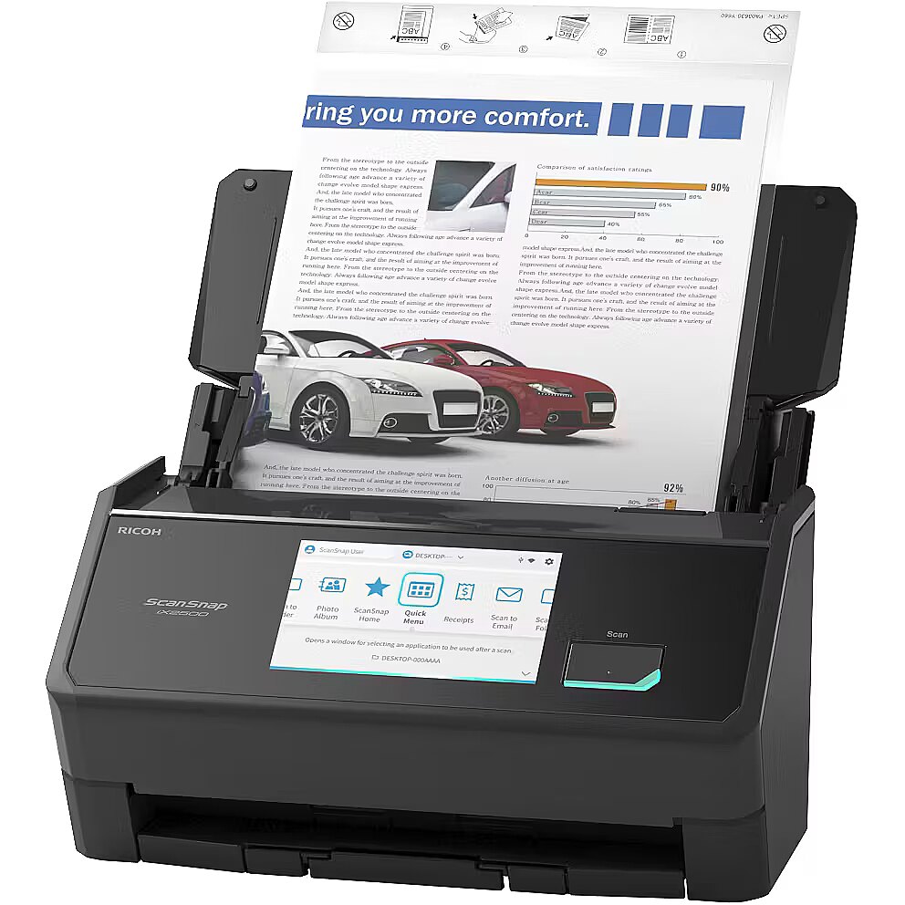 LongDesc - Offering total flexibility and convenience for modern home and office work, the iX2500 fits how and where you work. The Quick Menu offers instant ad-hoc scanning, while customised buttons can be easily created for recurring tasks – matching your own scanning preferences and habits. What’s more, usable scanned data can be instantly recognised and activated as a working link – enabling you to click directly on numbers or addresses to make phone calls or send emails in an instant.The gateway to digitising your life and working smarterIts small footprint also means the iX2500 can conveniently fit into many more desktop spaces than alternatives in the market. The iX2500 is also intuitively designed for an easy, effortless user experience. The 5-inch capacitive LCD touch screen offers popular ScanSnap design elements such as one-touch scanning directly from the unit, while its rapid 45 page per minute double-sided scanning speed and 100 sheet chute capacity mean you will breeze through your scanning tasks in no time. There’s plenty of personal productivity packed into our most versatile scanner yet, enabling simple digitisation of your documents and data, how you want, wherever you want.Smart data recognitionYour usable scanned data can be instantly recognised and activated as a working link – enabling you to click on numbers or addresses to make phone calls or send emails in an instant. No copy/paste necessary.Tailored to your scanning habitsMade to match your needs, the iX2500 features a Quick Menu for ad-hoc scanning while also enabling you to easily create customised buttons for recurring scanning tasks.Takes up less space while you scanThe iX2500 has an in-use footprint of only 477mm x 292mm. Significantly smaller than alternative productsIntuitive design for a quick and easy user experienceThe iX2500 features a 5-inch capacitive LCD screen with popular ScanSnap design elements including one touch scan for a simple scanning process.Scans quickly – saving you time and effortTo speed up the process even further, the iX2500 can hold up to 100 sheets and scan up to 45 double sided pages per minute.Software solutions that can assist with photo processing:• "PFU Clear Image Capture" – This feature is directly integrated into the iX2500 scanner.• ScanSnap Home – This software must be downloaded separately, but it offers additional features for photo scanning, including:- Automatic image enhancement- Color restoration of faded photos- Red-eye correction- Automatic image rotation