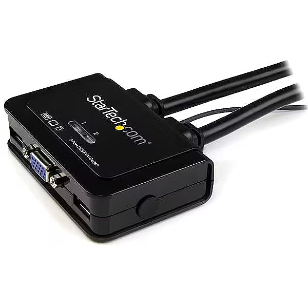 LongDesc - Control two VGA, USB-equipped PCs with a single monitor, keyboard, and mouse peripheral setThe SV211USB 2-Port VGA Cable KVM Switch lets you control two VGA, USB-equipped PCs with a single monitor, keyboard and mouse.To help organize your desk without sacrificing valuable work space, this VGA USB KVM switch features a compact footprint and integrated KVM cables that can be connected directly to your systems. Plus, the KVM is USB-powered, eliminating the need for a bulky external power adapter and wall outlet.This VGA KVM switch offers support for resolutions up to 2048x1536, for the ability to drive a high-resolution VGA display. For simple switching between connected systems, the KVM features a convenient push-button remote switch on a 1.5 meter (5ft) cable, as well as keyboard hot-key support and PC or Mac compatible switching software.Backed by a StarTech.com 2-year warranty and free lifetime technical support.The StarTech.com Advantage- Avoid cabling hassles with integrated KVM and remote switch cables- Save desk space with a compact design- Switch between systems easily using the included remote switch
