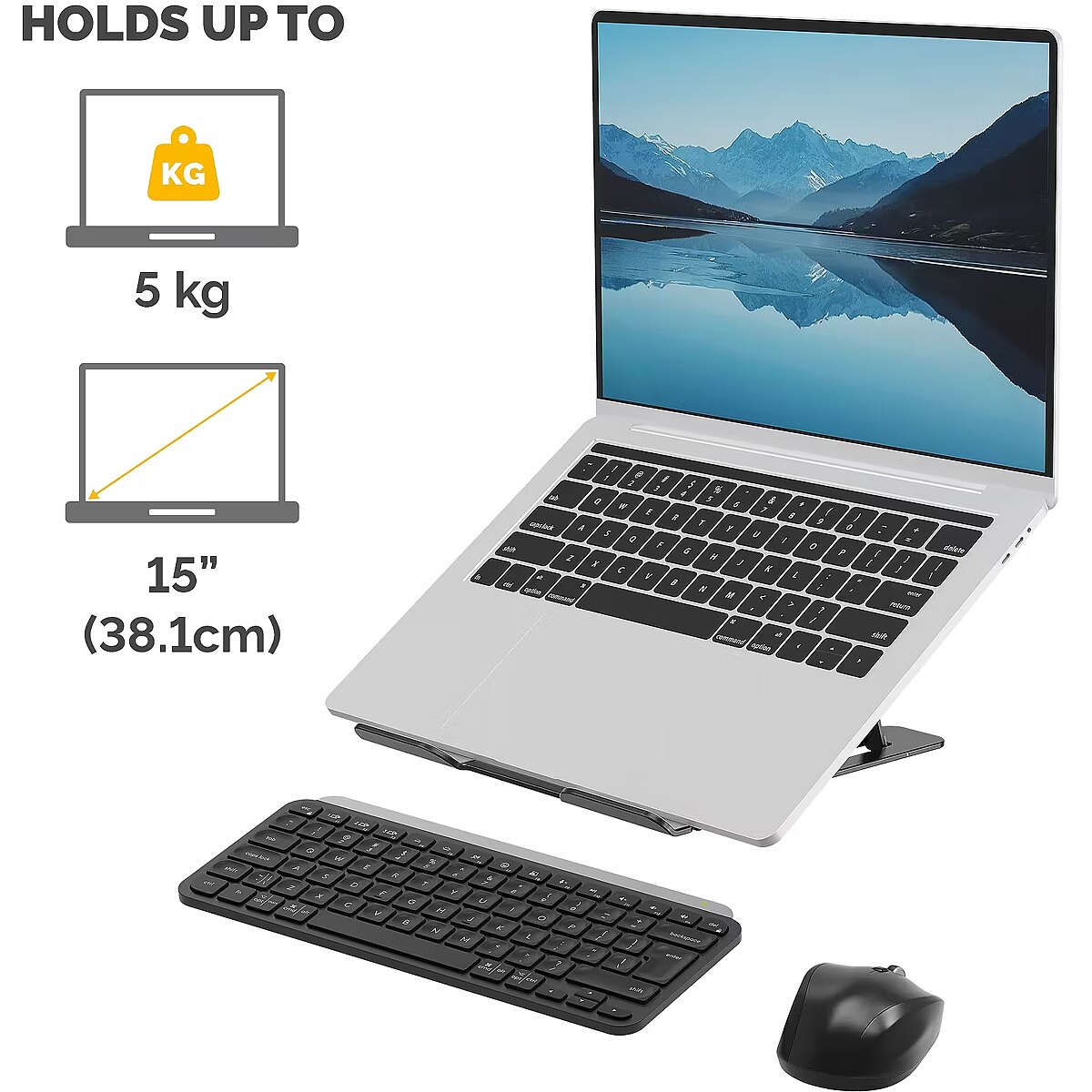 LongDesc - The Fellowes Alumia Portable Laptop Stand is designed to help minimise discomfort in your workspace by elevating your laptop to a more ergonomically correct viewing position, reducing neck and eye strain. It supports laptops up to 5kg in weight and screen sizes up to 15 inches. With six easy-to-use height adjustments ranging from 8.1 to 13 cm, it promotes good posture and all-day comfort. The compact and lightweight design folds flat, making it perfect for storage or on-the-go use - ideal for hybrid working environments. Nonslip pads keep your laptop securely in place, while the open design enhances air circulation to help keep your device cool. The Alumia Portable Laptop Stand is FIRA-accredited, meeting the ergonomic requirements of European Health and Safety legislation (EN ISO 9241-5). This laptop riser comes with a 5-year warranty and access to top quality customer support to help with any queries you may have.