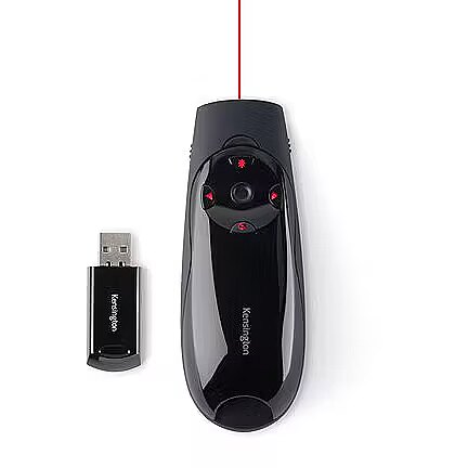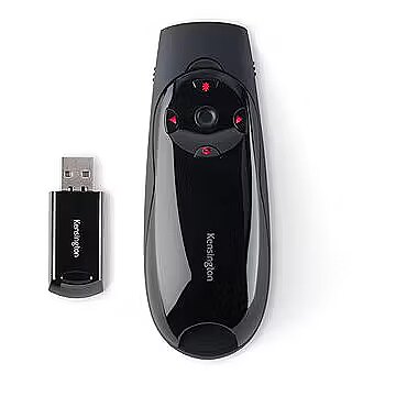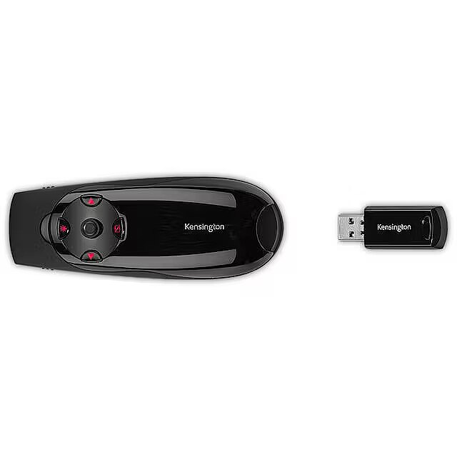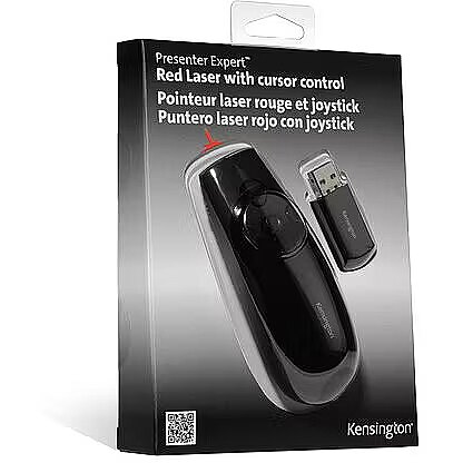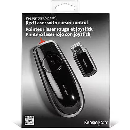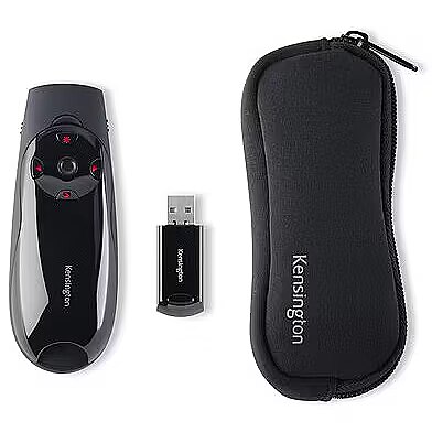 Technical_details - Take control of the room—and your computer’s cursor— with the Kensington Presenter Expert Red Laser Presenter with Cursor Control. The best wireless presenter is the one you don`t have to think about because everything is intuitive. The Kensington Presenter Expert is just that. Now you can focus on wowing your audience rather than focusing on the operation of your presenter. The simple four-button design makes it easy to navigate your Keynote® or PowerPoint® presentation. And the red laser helps you make your point from across the room. But sometimes pointing just isn’t enough. That’s where the Presentation Expert’s cursor control comes into play. With a simple flick of a switch, you’ll toggle between presentation and cursor control modes. The powerful 2.4Ghz remote resists interference and lets you control Keynote or PowerPoint from up to 150 feet (50 meters) away. The USB receiver stores inside the presenter so you won’t have to worry about losing it. Dark rooms can be a challenge for some wireless presenters. But the Kensington Presenter Expert has backlit buttons so you’ll always find the correct button. There’s also a low battery indicator to eliminate surprises. And the whole thing packs in a handy carrying pouch. - Wireless range up to 150 feet (50 meters)