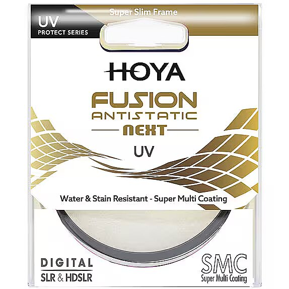description_en - HOYA engineers have developed a new ANTISTATIC coating that acts like a force field around the filter to repel dust. Perfect for environments where dust is common, these filters require less frequent cleaning and maintenance than traditional filters. Additionally, the hardened, antistatic top-layer is water repellent and stain resistant, and cleans easily when smudges or fingerprints are introduced to the surface. The UV filter cuts unwanted ultra-violet rays, reducing haze and increasing clarity. The new FUSION ANTISTATIC NEXT professional filters are made in Japan using hand selected silicates that are carefully smelted and blended to yield high performance optical glass. HOYA then uses extreme care and precision to apply the Improved 18-Layer Super Multi-Coating (both sides) formula which greatly reduces or eliminates reflections on the surface of the glass and yields a ultra clear high transmission rate. This means the filter has virtually no effect on the color balance, contrast, or clarity of the final image. The filters features a lightweight, one-piece, low-profile aluminum frame to house the glass. This one-piece design allows the filter to maintain perfect parallel alignment to the sensor plane for maximum sharpness, while the low-profile form eliminates vignetting when used on ultra-wide-angle lenses. Antistatic coating repels dust Ultra Clear High Transmission Stain resistant - Protects against exposure to ink, markers etc. Water repellent – Water beads up and wipes away easily Fingerprints and smudges wipe away cleanly Filters unwanted UV light before it reaches the sensor HOYA's Professional-grade optical glass HOYA exclusive one-piece, low-profile filter frame with front filter threads
