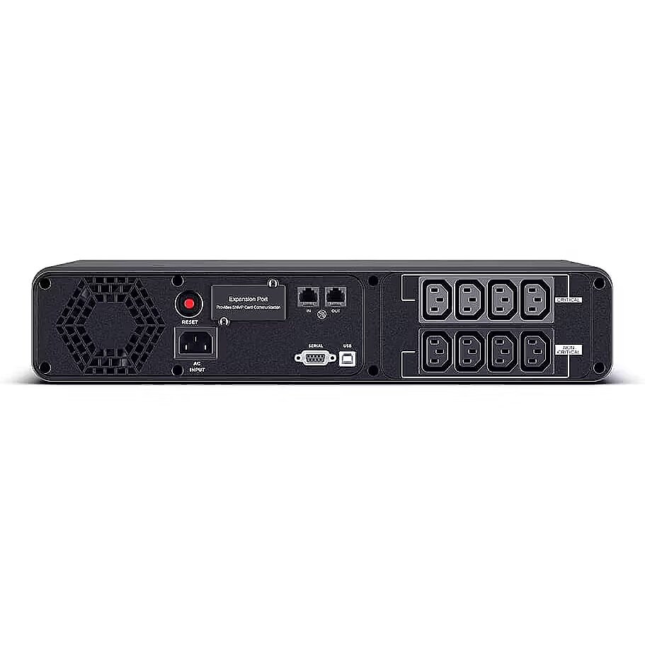LongSummaryDescription - CyberPower CP1600EIPFCRM2U. UPS topology: Line-Interactive, Output power capacity: 1.6 kVA, Output power: 1000 W. AC outlet types: C13 coupler, Power plug: C14 coupler, AC outlets quantity: 8 AC outlet(s). Battery technology: Sealed Lead Acid (VRLA), Typical backup time at full load: 2.5 min, Typical backup time at half load: 10.4 min. Form factor: Rackmount, Product colour: Black, Housing material: Metal. Compliance certificates: CE, RoHS